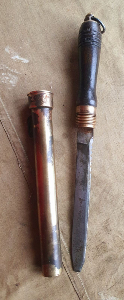 Taucher-Messer, guter Zustand. Ausführung mit Stahlklinge, das Klingenende ist als Schraubendreher ausgeführt. Messingscheide vorhanden, Gewinde funktionsfähig. Altersbedingte Gebrauchsspuren vorhanden, insgesamt jedoch ein ordentlicher und interessanter Zustand.