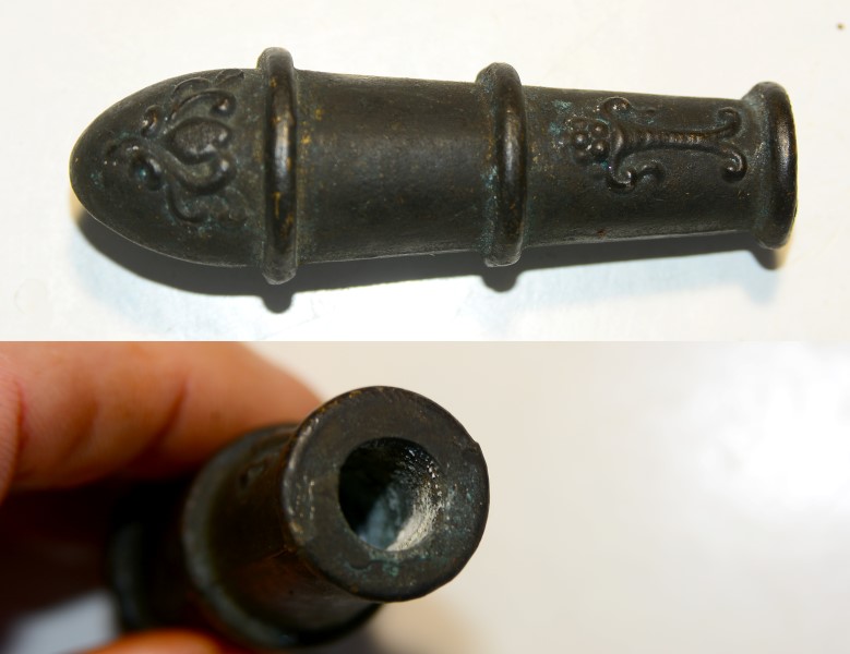 Gegossener Lauf für Modellkanonne, Länge 87mm, Kaliber 10,5mm, das Spundloch ist nicht gebohrt, Bronze, guter Zustand mit Alterspatina