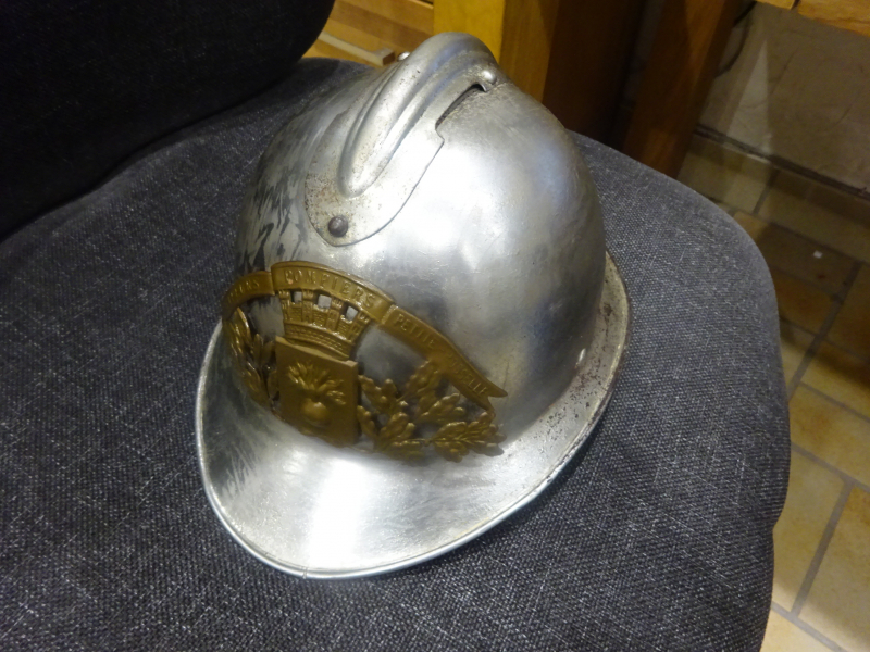 Stahl-Helm der franz. Feuerwehr Form Adrian ( etwa 1940/50 - ähnlich der franz. Armee -) aufgesetzter Blechkamm,