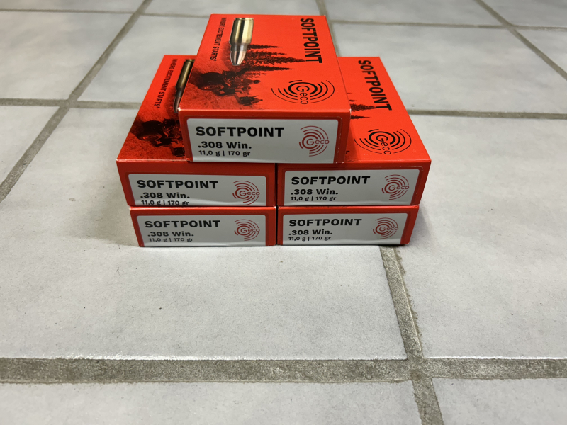 5 Packungen a) 20 Stück .308 Win./170 grs. Gecco Softpoint Patronen.