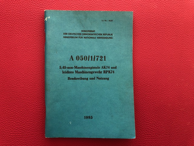 ORIGINAL, 96 Seiten , schöne ausführliche Dienstvorschrift zur moderneren Kalaschnikow im Kaliber 5,45x39, die Waffe wird beschrieben, die Funktionsweise erklärt, Reinugen, Anschlagarten bis hin zum Schießen auf verschiedenste Ziele, beweglich, unbeweglich, Luftziele, Schießen bei Nacht.