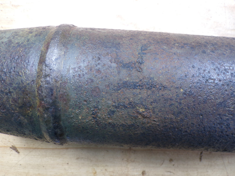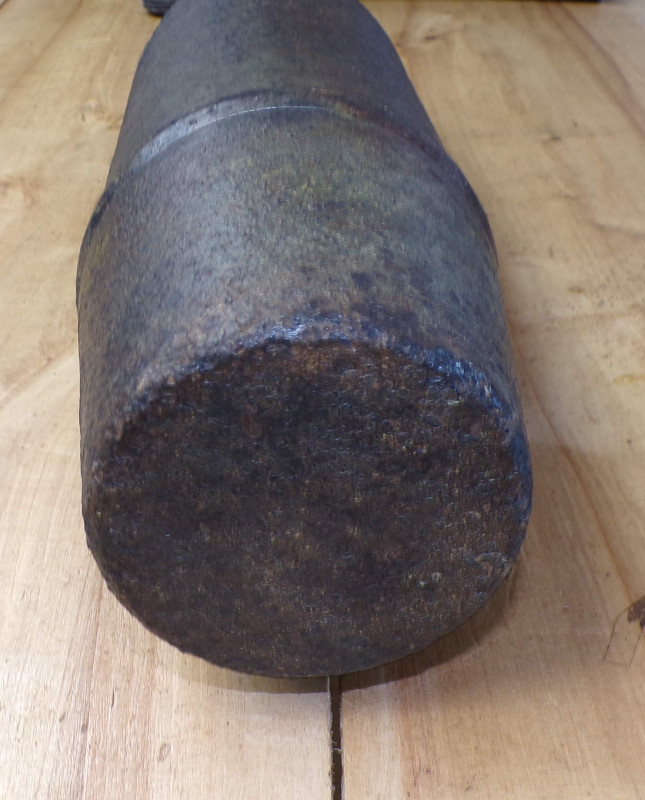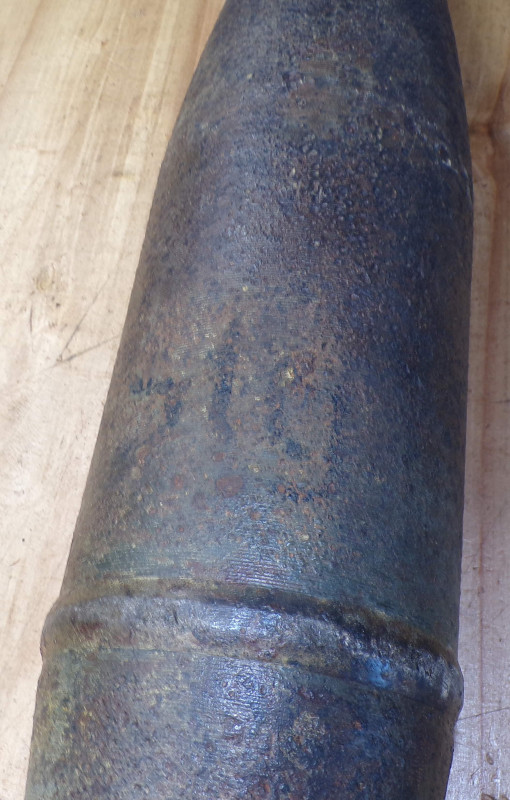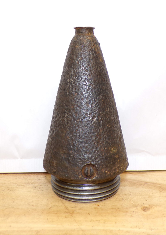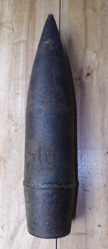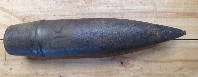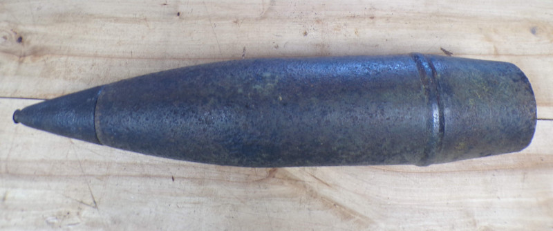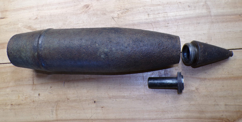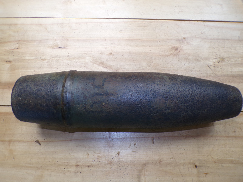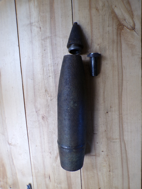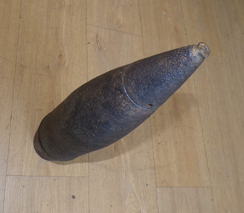 10,5 Geschoß für Leichte-Feld-Haubitze 18 im einen gutem zustand. Teilweise noch im Farbe. Baujahr 1945, Hersteller - drei code - "bfh", "mog" und "dex". Auf oberflasche sicht man auch (wenn trocken ist) buchstabe "Stg" - sehen Fotos.Ganz frei von gefahrstoffen.