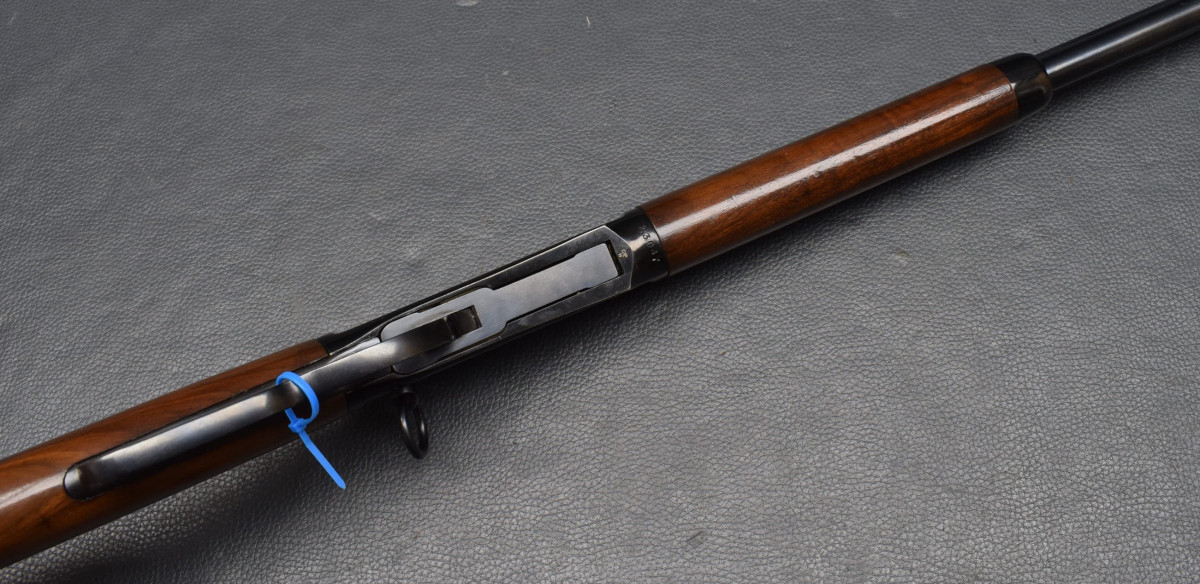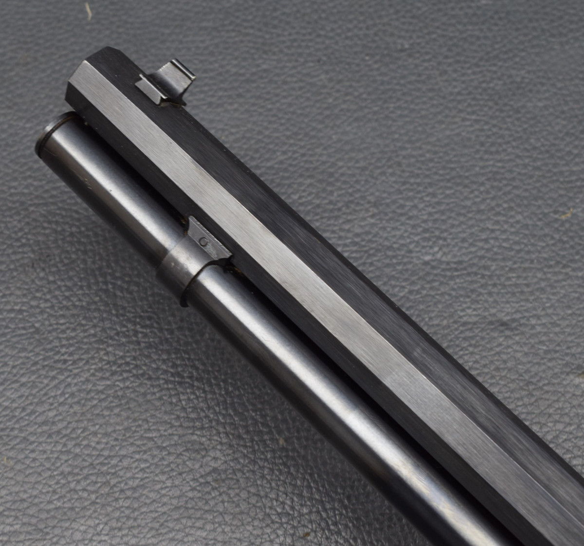 Achtkantlauf mit Lauflänge 26", brünierter Systemkasten. Auf der linken & rechten Seite des Gehäuses kanadisches Ahorn. Buckhorn Visierung, Direktabzug, außenliegender Hahn, Magazinrohr unter dem Lauf. Nußbaumschaft, brünierte Stahlschaftkappe . Lauf sehr gut, Brünierung 97%, Schaft sehr gut, Gebrauchtwaffe sehr gut