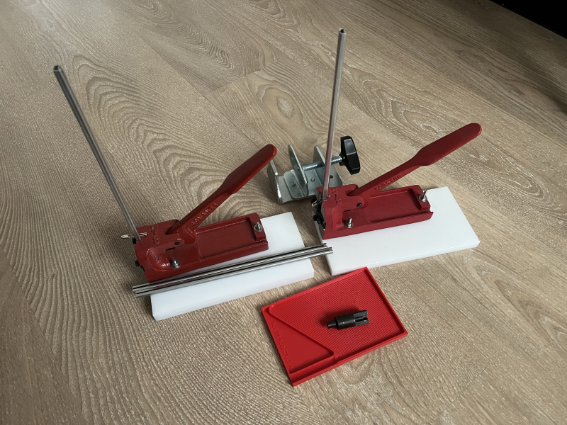 Außerdem dabei ist eine Zünhütchenwendebox und ein weiterer Stempel für kleine Zündhütchen sowie eine einfache Tischmontage. Die beiden Geräte kommen jeweils auf PVC-Platten geschraubt.