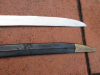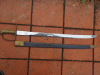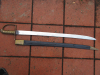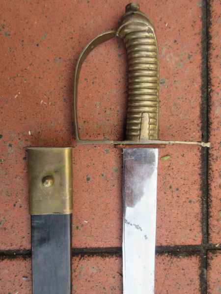 63,5 cm lange und 30 mm breite Keilklinge, vernickelt, gerilltes Messinggefäß, Gesamtlänge 76 cm. Originale Lederscheide, Naht geschlossen,auf einer Stelle ein paar kleine Risse, Messingbeschläge, Porto EU 19 Euro. Österreich 10 Euro.