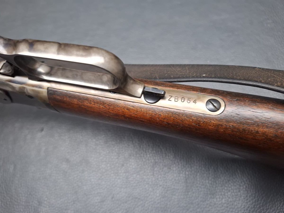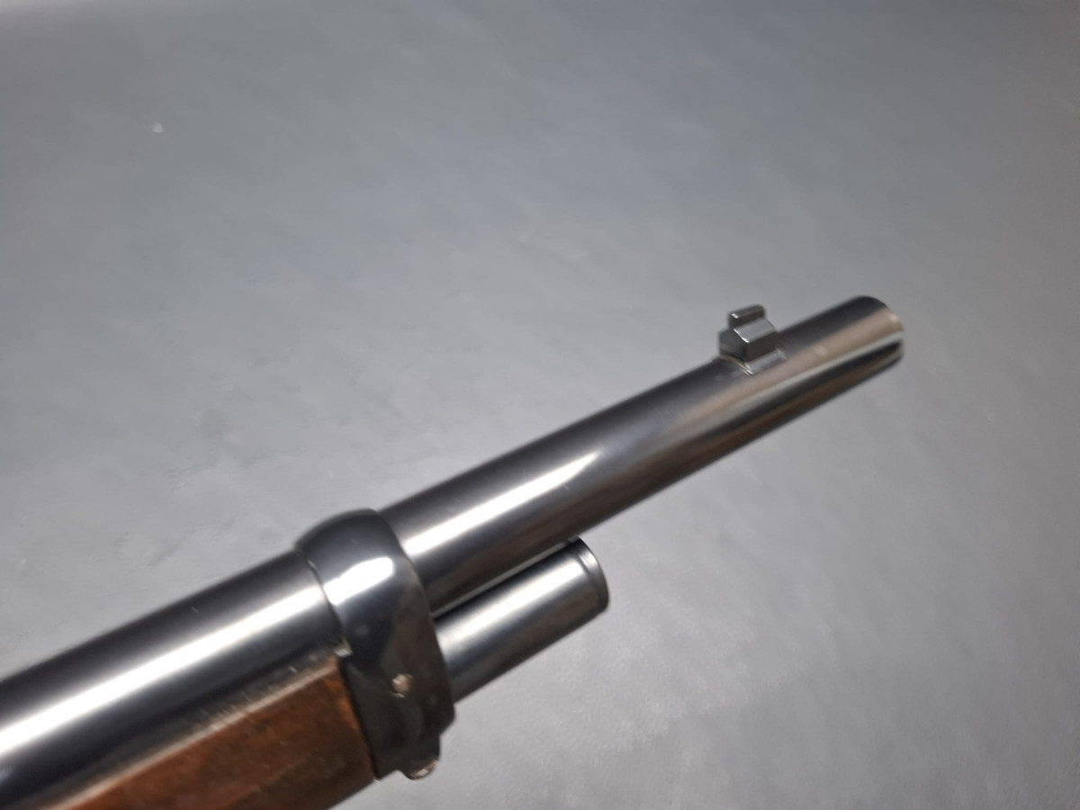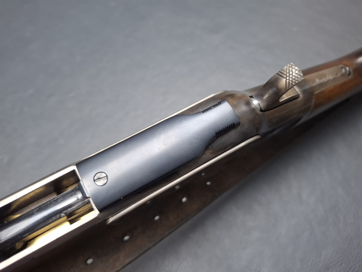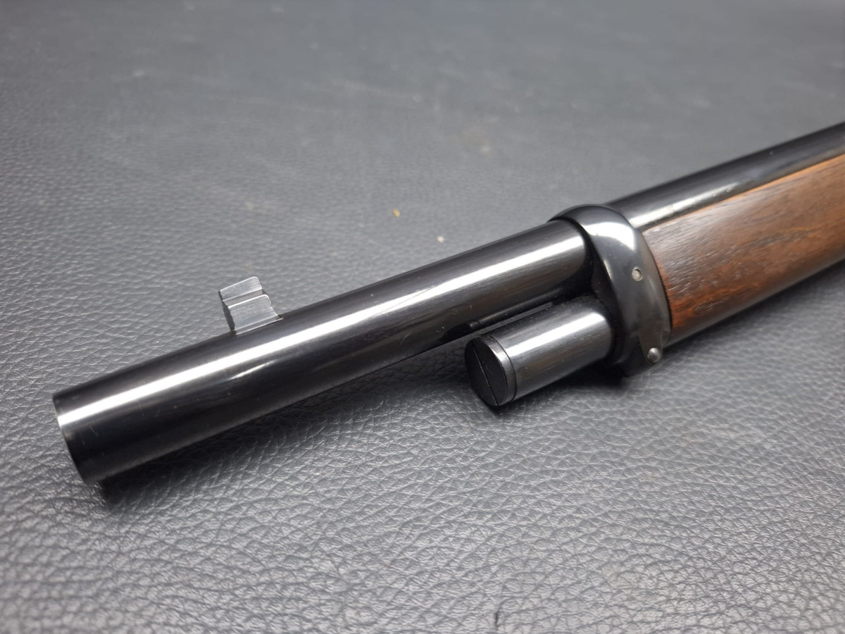 Lauf tiefschwarz brüniert,verstellbares Klapp-Visier, Stahl-Systemkasten buntgehärtet, sehr guter Direktabzug, außenliegender Hahn, Magazinrohr unter dem Lauf.