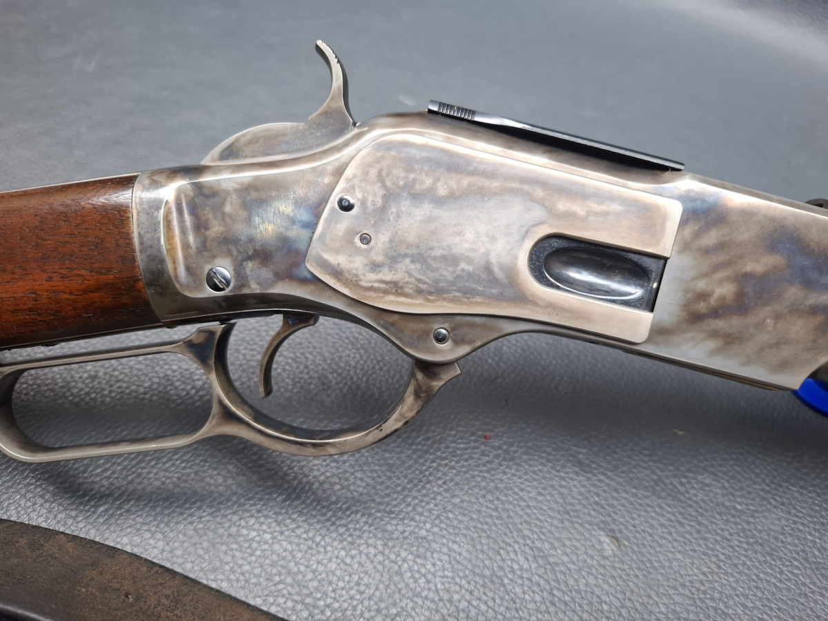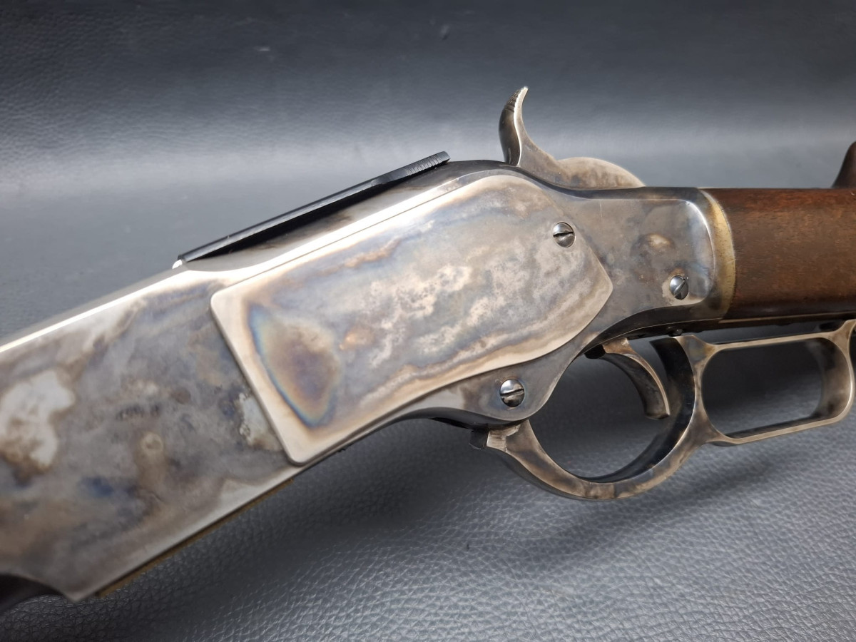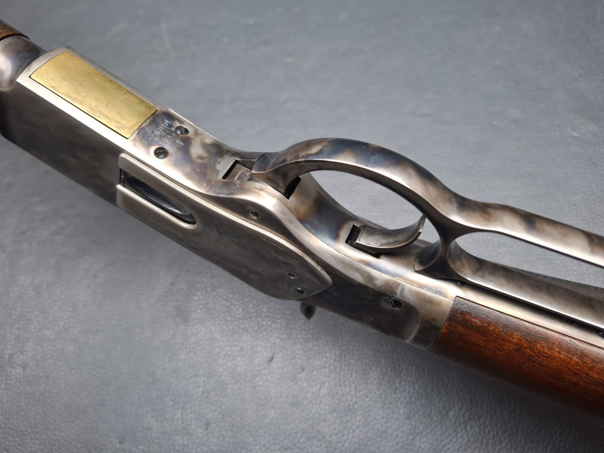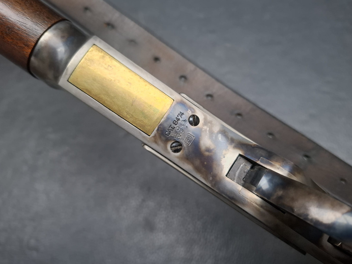 Lauf tiefschwarz brüniert,verstellbares Klapp-Visier, Stahl-Systemkasten buntgehärtet, sehr guter Direktabzug, außenliegender Hahn, Magazinrohr unter dem Lauf.