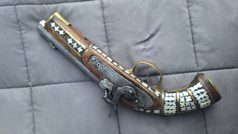 Zum Angebot steht eine wunderschöne Percussionspistole aus Afganistan mit kunstvollen Perlmutteinlagen. Sie ist mal technisch restauriert worden und hat einen gezogenen Lauf aus einer Replica Percussionspistole (Bausatz) im Cal 45 BP. Auch das Schloß wurde mal aufwändig