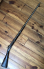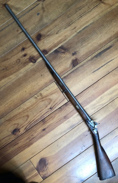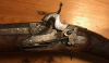 Miquelet Gewehr, seltenes linksliegendes Schloss, aptiert auf Perkussion, Schloss komplett und funktioniert. Gesamtlänge 134cm, Lauf 98cm. Verschiedene silberne Einlegearbeiten im Lauf u.a. auch die Zahl 1859? Laufdurchmesser an der Mündung 2cm. Ladestock nicht vorhanden. Kolben ersetzt, wahrscheinliche alte Reparatur. Messingkorn.