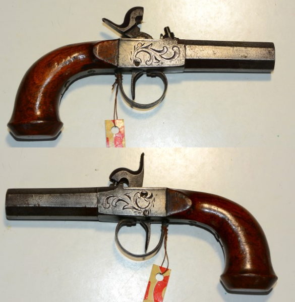 Französische Perkussionsterzerol, 8-Kant-Lauf mit 64mm Länge, Gesamtlänge 19,1 cm, Kaliber 12,7 mm, guter Zustand und ohne Mängel