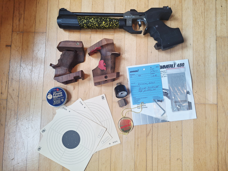 Sie bieten hier auf ein umfangreiches Set rund um die bewährte Match-Luftpistole Hämmerli 480 (Made in Switzerland). Die Waffe ist technisch funktionsfähig, weist jedoch optische Gebrauchsspuren auf, die ich in den Detailfotos ehrlich dokumentiert habe.