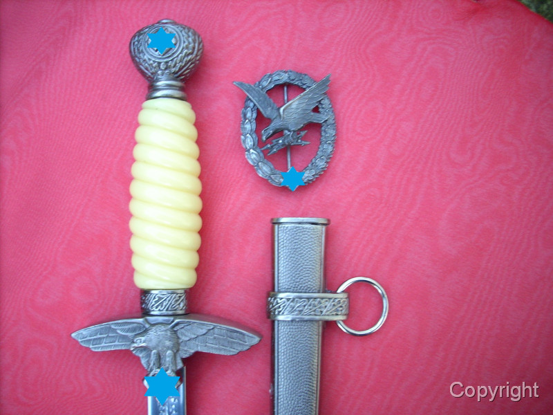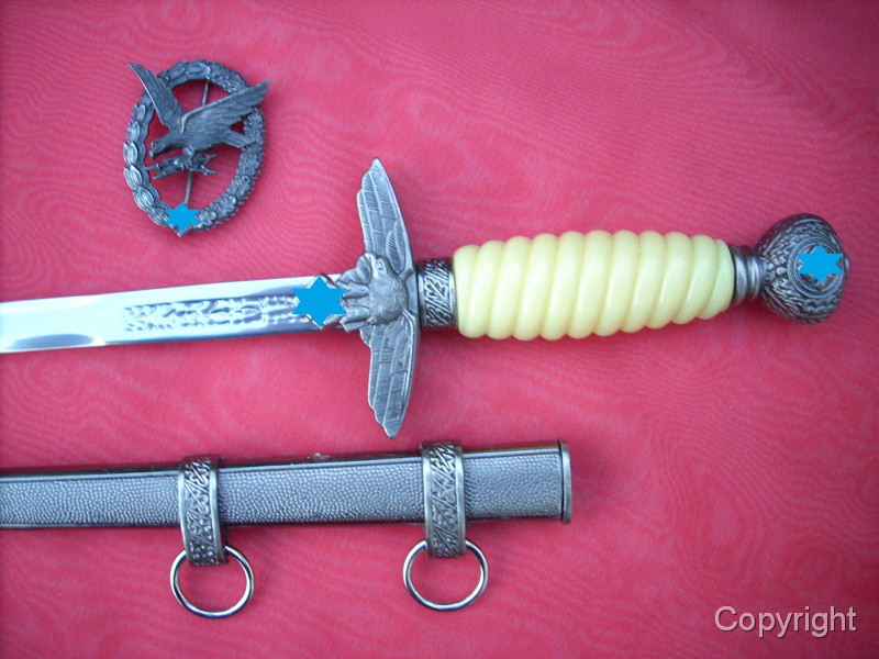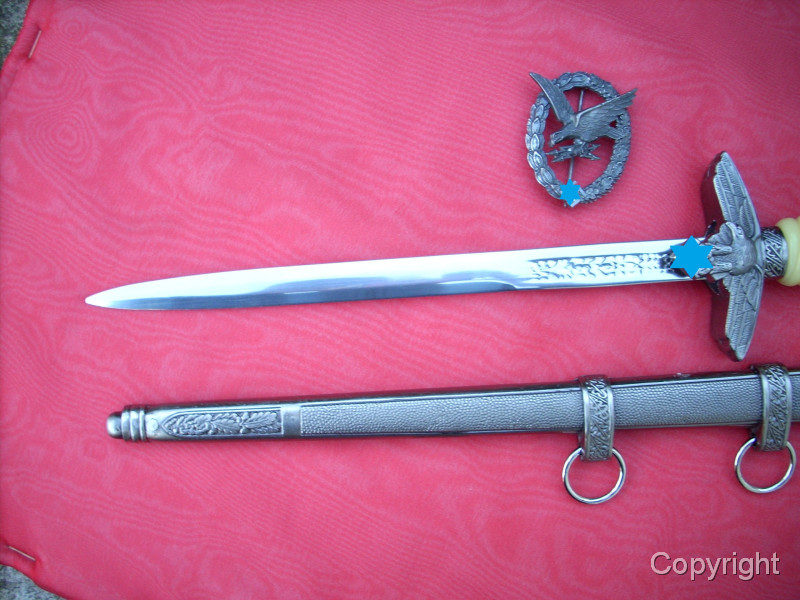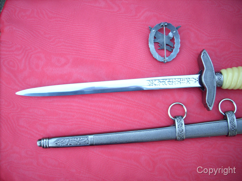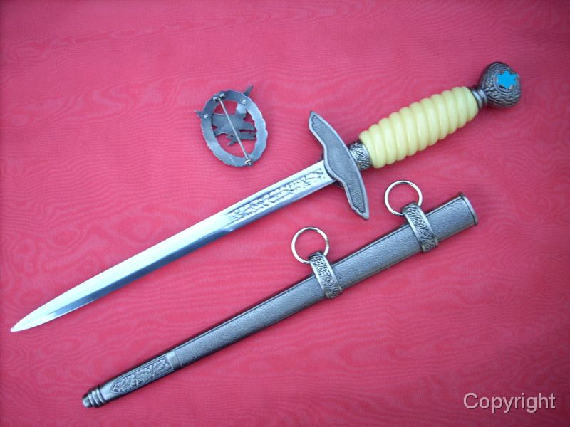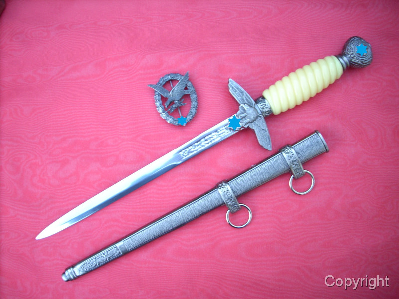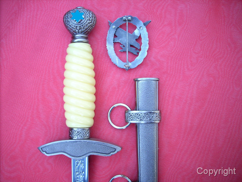 Sehr schönes Set: Luftwaffendolch LOD für Offiziere der Luftwaffe mit Verzierungen auf der Klinge. Dabei ein Fliegerschützenabzeichen mit Blitzbündeln. Äußerst geringe Gebrauchsspuren. Kein Herstellerlogo. Sehr guter Zustand siehe Fotos, die, wie immer, Bestandteil der Artikelbeschreibung sind. Keine Garantie und keine Rücknahme.