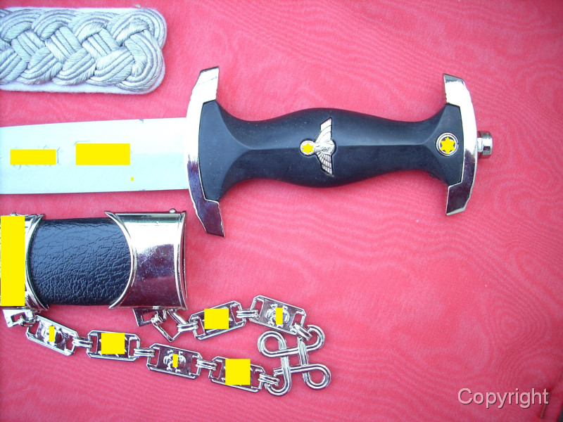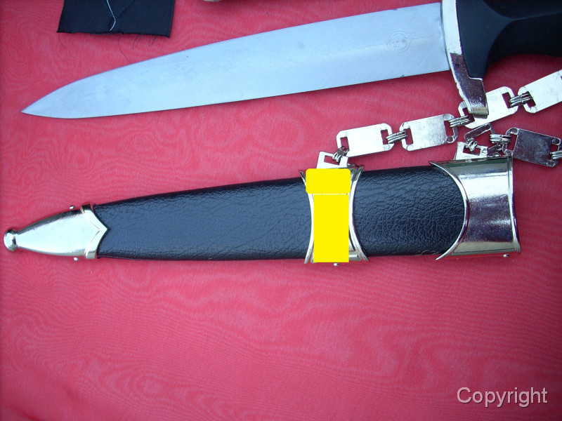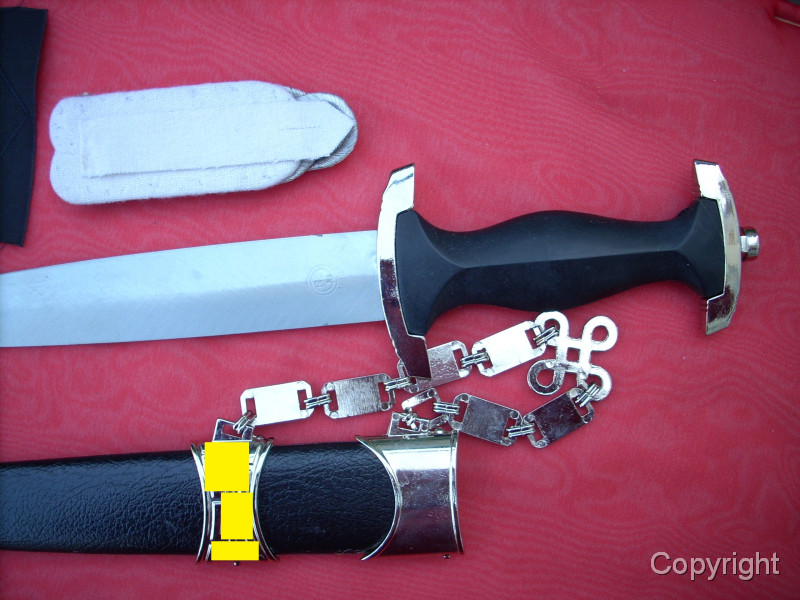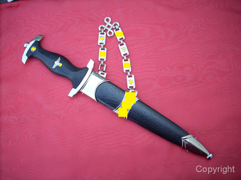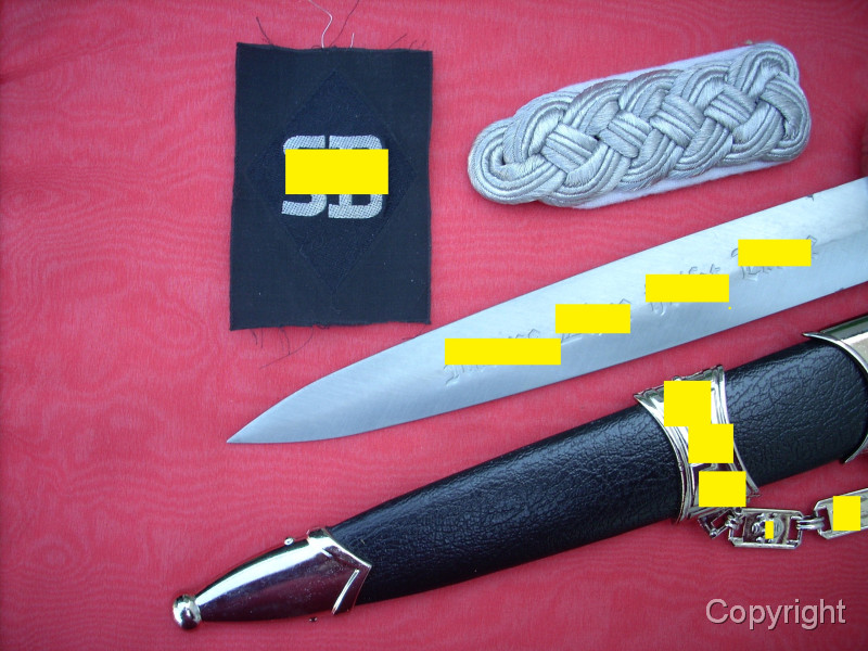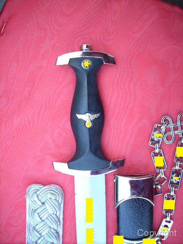 Sehr schöner SS-Kettendolch mit bezogener Scheide. Dabei eine gewebte SD-Ärmelraute (Sicherheitsdienst) + 1 Schulterklappe. Geringe Gebrauchsspuren. Mit RZM-Herstellercode RZM M7/14 (steht für P.D. Lüneschloß, Solingen). Das Motto auf der Vorderseite schön tief geätzt. Pastille und Adler sauber eingelegt.. Gesamtzustand siehe die Fotos, die, wie immer, Bestandteil der Artikelbeschreibung sind. Keine Garantie und keine Rücknahme.