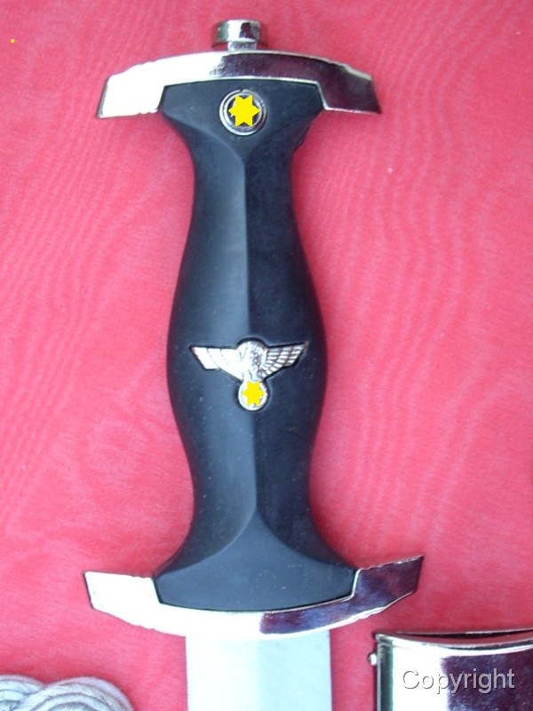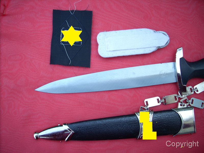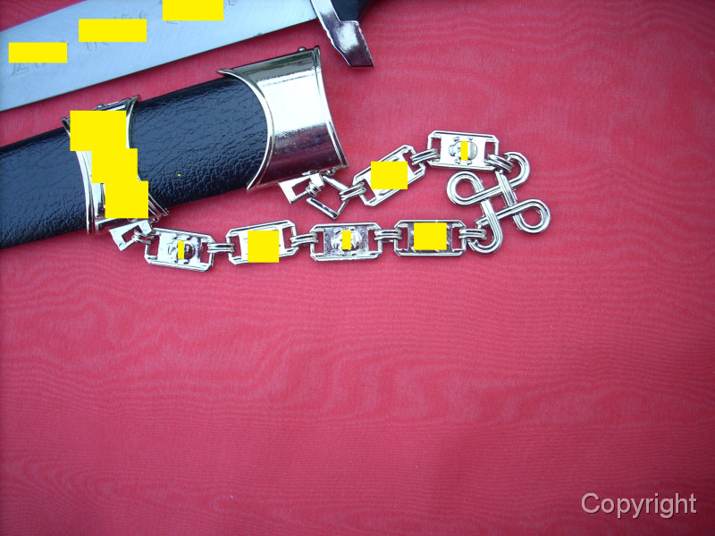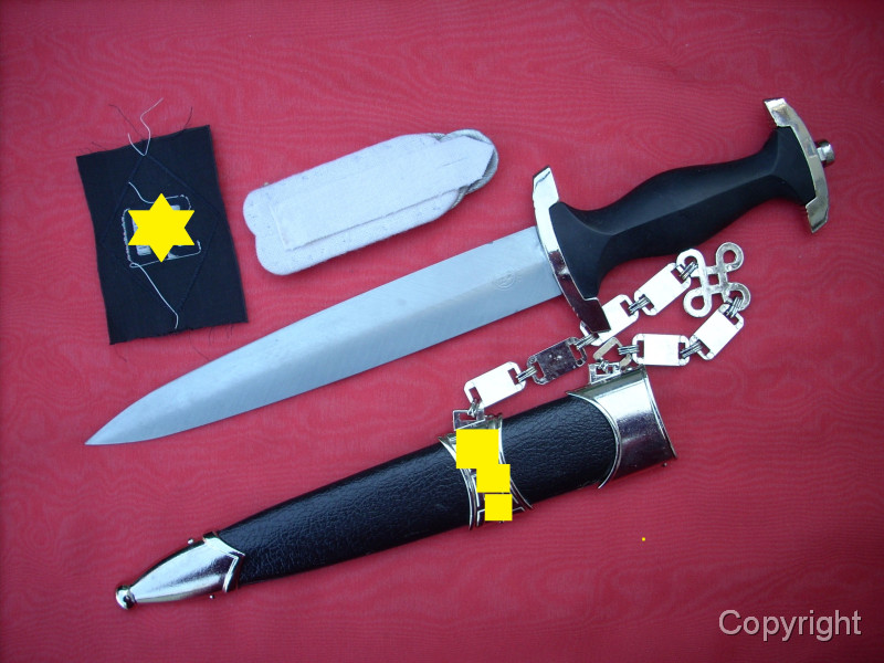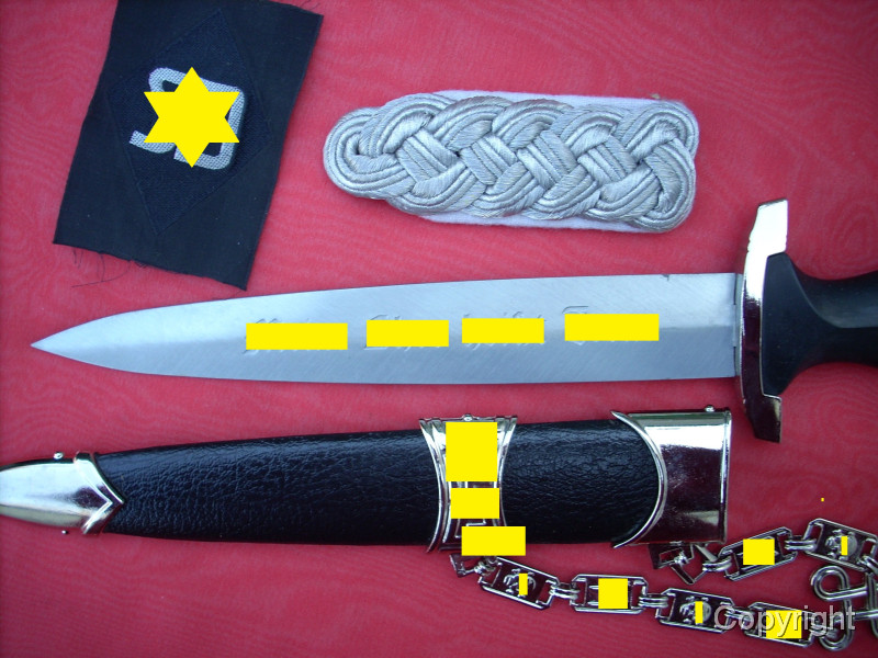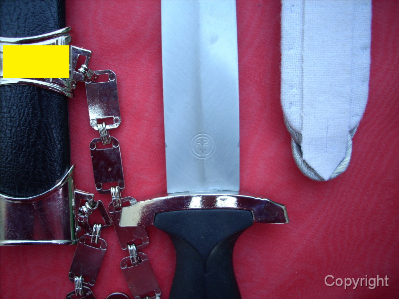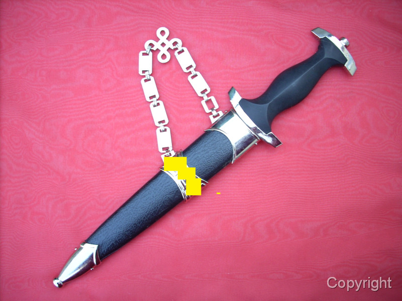 Sehr schöner SS-Kettendolch mit bezogener Scheide. Dabei eine gewebte SD-Ärmelraute (Sicherheitsdienst) + 1 Schulterklappe. Geringe Gebrauchsspuren. Mit RZM-Herstellercode RZM M7/14 (steht für P.D. Lüneschloß, Solingen). Das Motto auf der Vorderseite schön tief geätzt. Pastille und Adler sauber eingelegt.. Gesamtzustand siehe die Fotos, die, wie immer, Bestandteil der Artikelbeschreibung sind. Keine Garantie und keine Rücknahme.