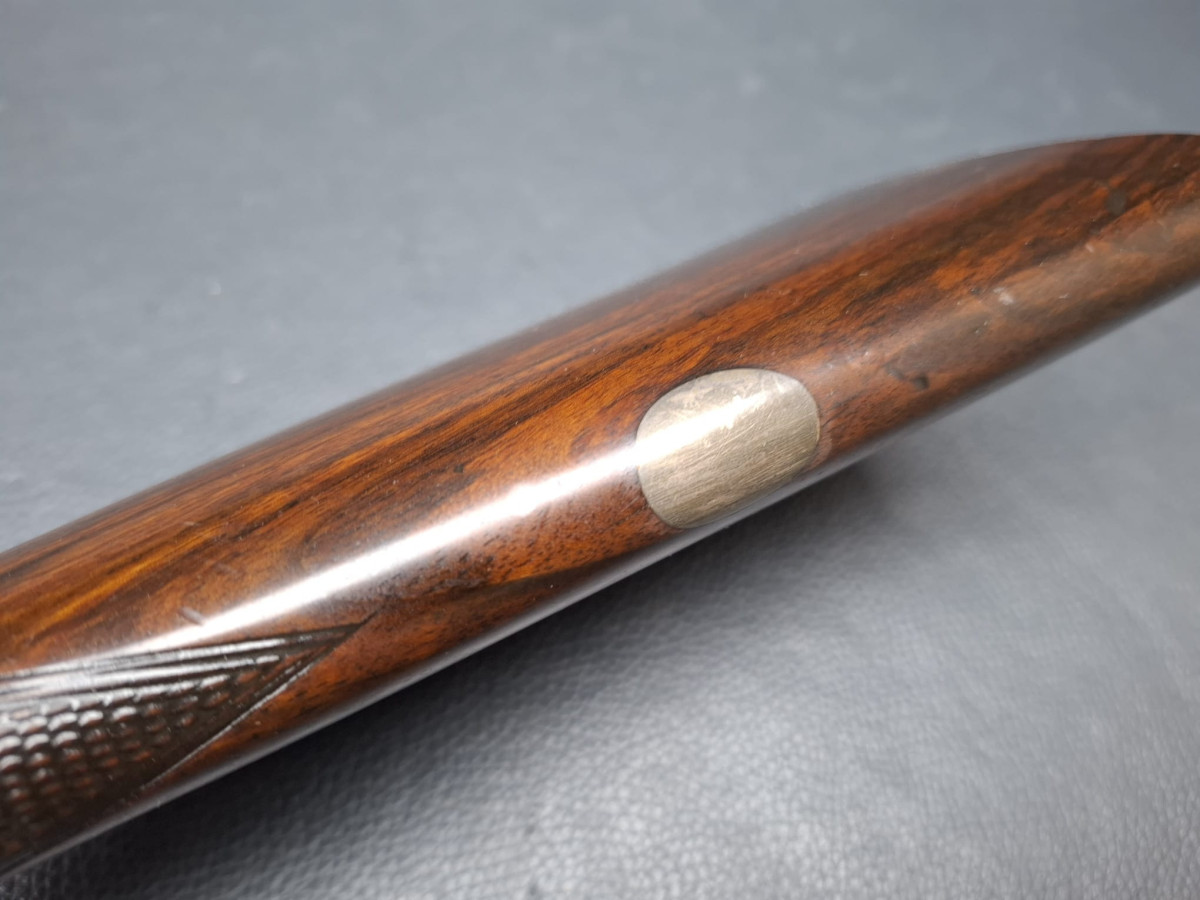 Lauf tiefschwarz brüniert mit feinem Messingkorn, helle Basküle graviert mit partiell mit Resten von Bunthärtung, Schlossplatten graviert,