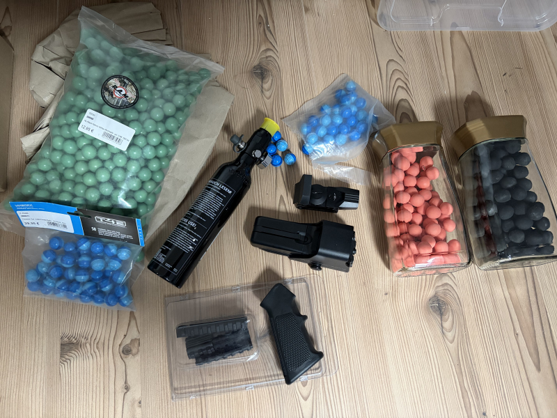 Habe ich noch über. Gummikugeln und ein 500 er pack Paints + Zubehör, 2 Red Dots, hpa flasche