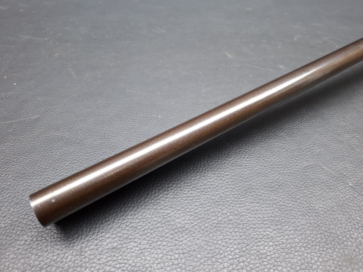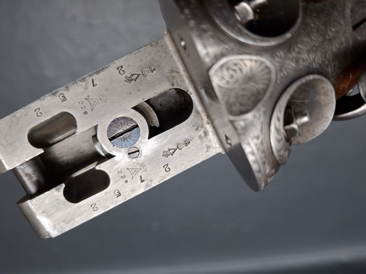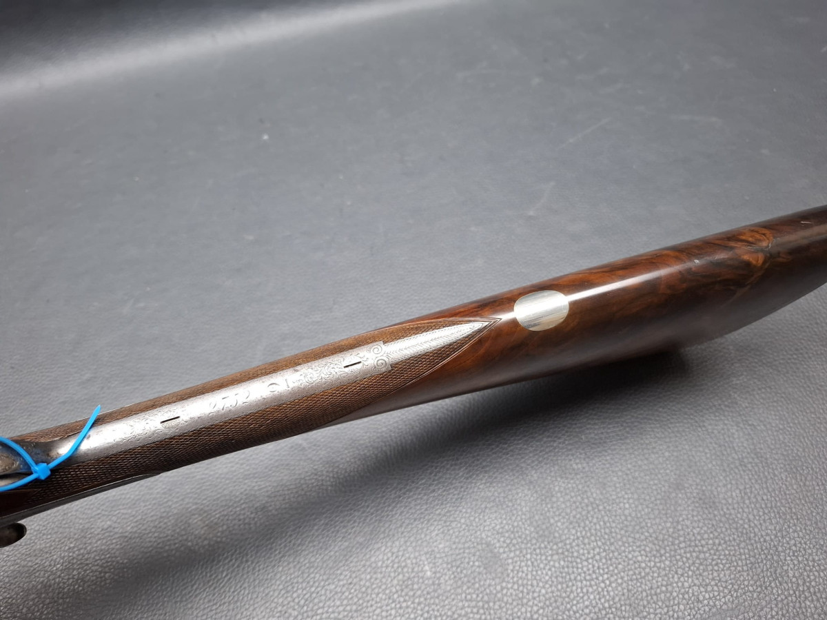 Damastlauf fein bräuniert mit feinem Messingperlkorn, helle Round Body Basküle dezent und elegant graviert