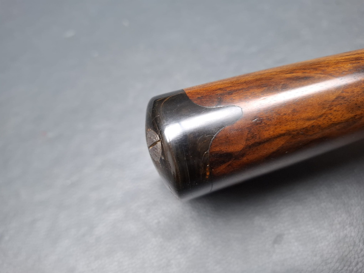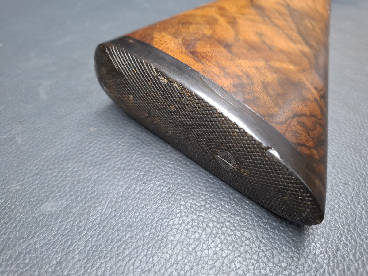 dunkler Nussbaumschaft und intensiver Maßerung, seidenmattes Ölfinish und Horn-Schaftkappe, ungravierter Schaftnagel