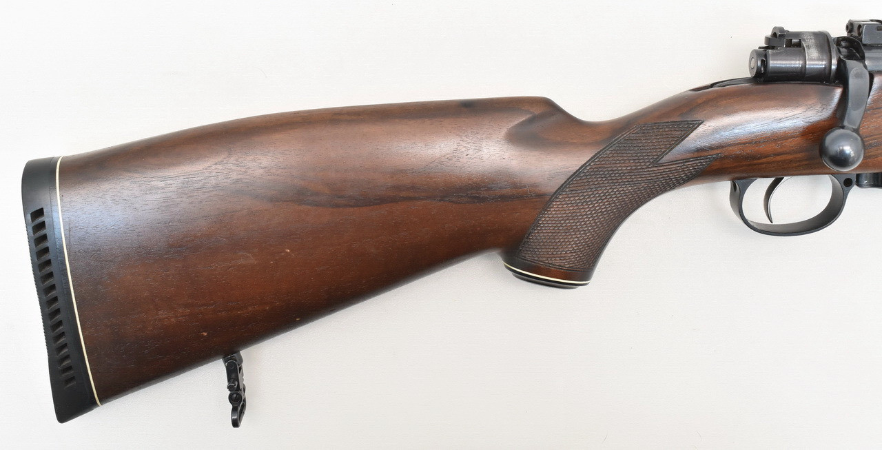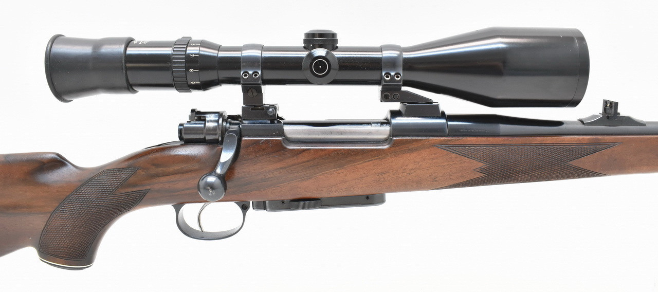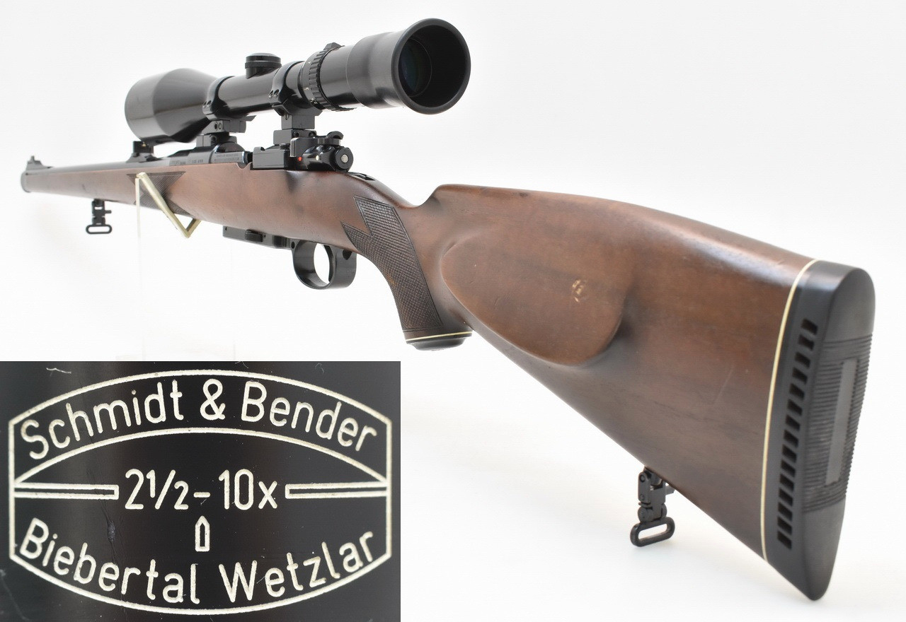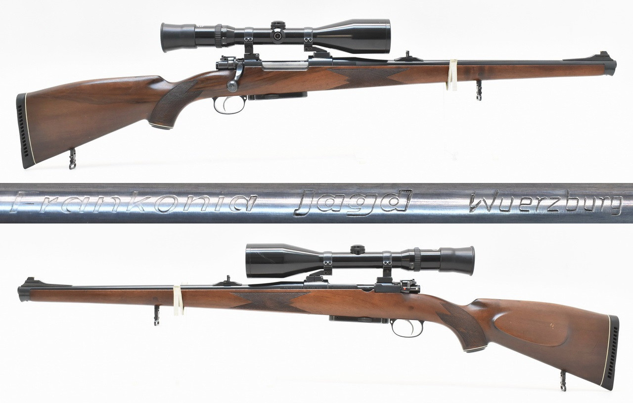 Ganzgeschäfteter FRANKONIA Jagd - Repetierer Modell Favorit mit bewährtem 98´er System aus DWM Fertigung. Schlößchen mit seitlicher 2 Stellungssicherung und Entstechfunktion. Kombiabzug / Rückstecher. Einsteckmagazin für 3 Patronen. Spiegelblanker Lauf. Mellrichstädter Beschuß 1991. 354mm langer Rechtsschaft mit Backe ( Schaftlänge gemessen vom Abzug bis Mitte Gummischaftkappe ). Variables Schmidt & Bender Zielfernrohr 2,5 - 10 x 56 mit Absehen 4 . EAW - Schwenkmontage. Augenabstand 292mm. Trage- und Gebrauchsspuren sind vorhanden. Details siehe Bilder.