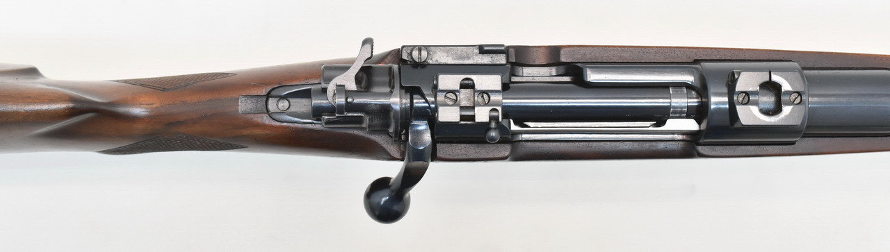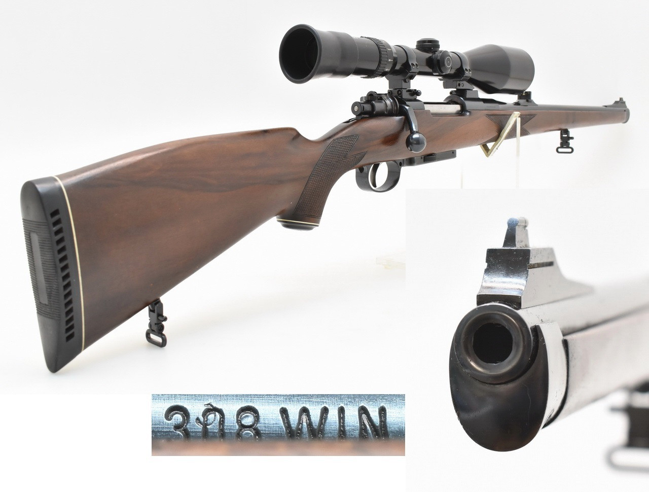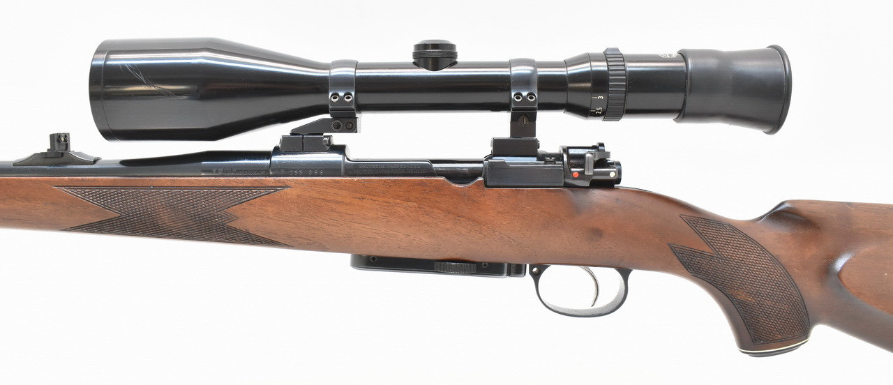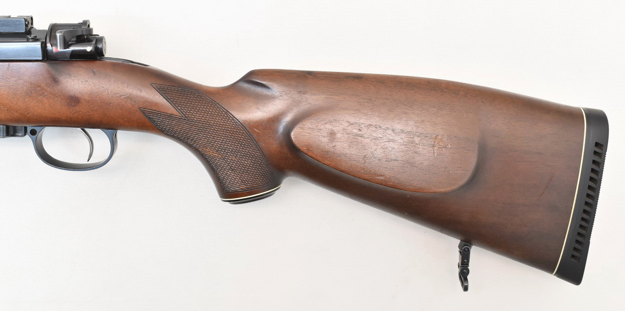 Ganzgeschäfteter FRANKONIA Jagd - Repetierer Modell Favorit mit bewährtem 98´er System aus DWM Fertigung. Schlößchen mit seitlicher 2 Stellungssicherung und Entstechfunktion. Kombiabzug / Rückstecher. Einsteckmagazin für 3 Patronen. Spiegelblanker Lauf. Mellrichstädter Beschuß 1991. 354mm langer Rechtsschaft mit Backe ( Schaftlänge gemessen vom Abzug bis Mitte Gummischaftkappe ). Variables Schmidt & Bender Zielfernrohr 2,5 - 10 x 56 mit Absehen 4 . EAW - Schwenkmontage. Augenabstand 292mm. Trage- und Gebrauchsspuren sind vorhanden. Details siehe Bilder.