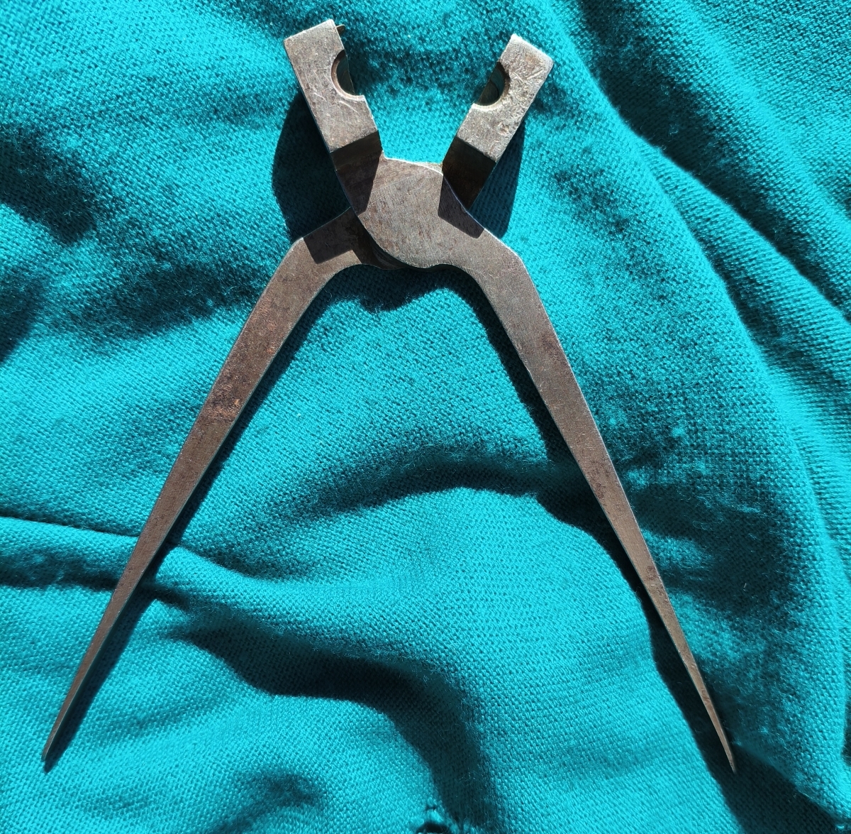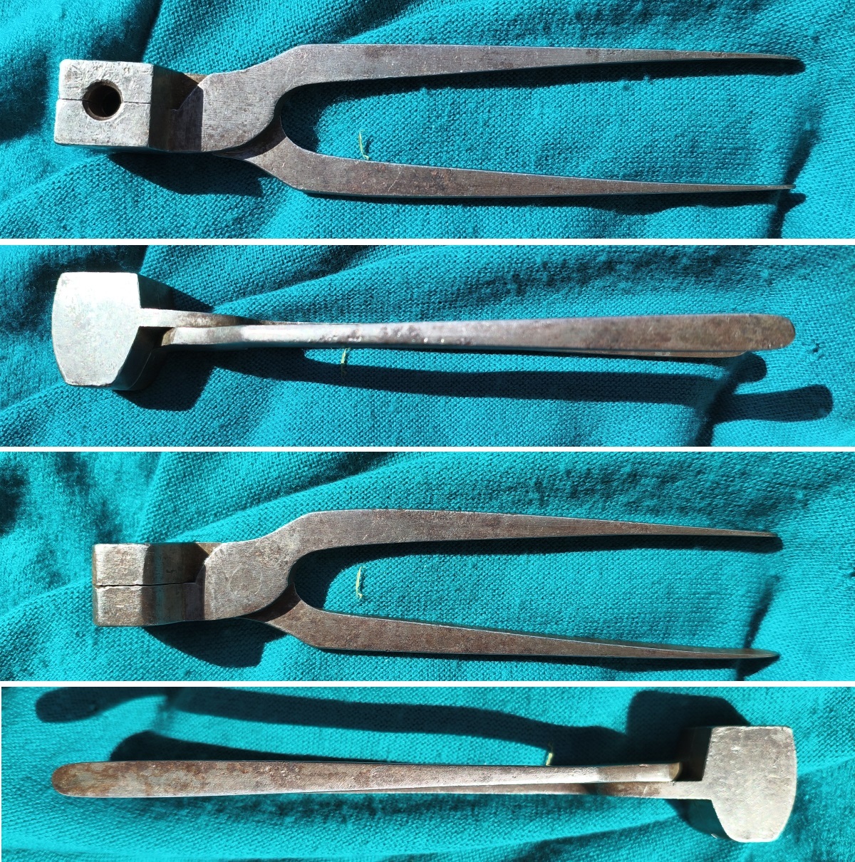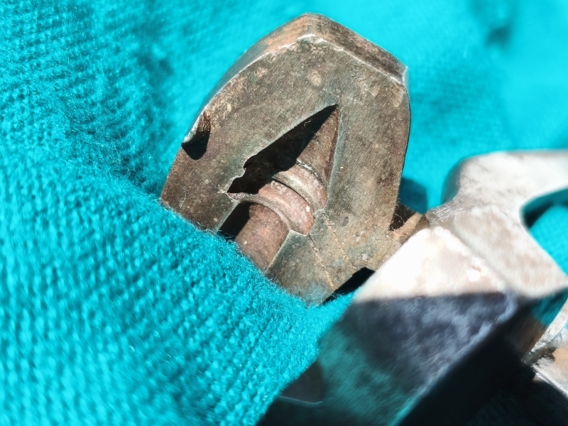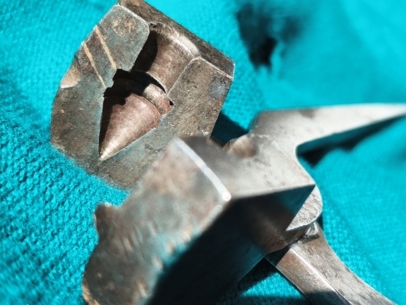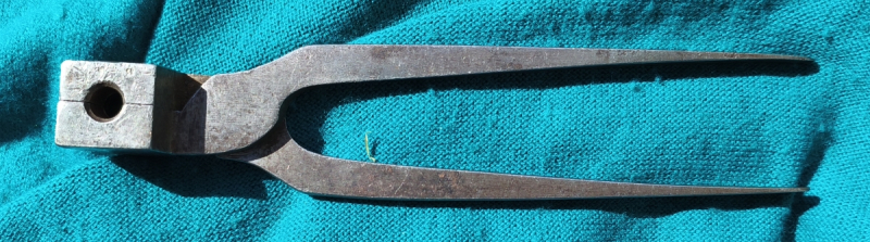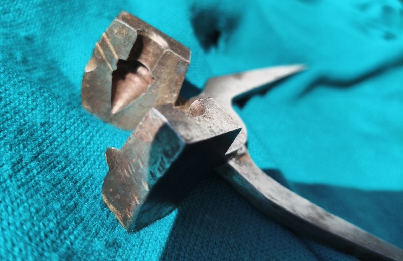 Originale Geschosszange bzw. Kokille für Spitzkopfgeschoss, Kal. circa 10,7mm. 2 Führungsringe, 1 Fettrille. 19 Jahrhundert. Zangenlänge 19.3cm.