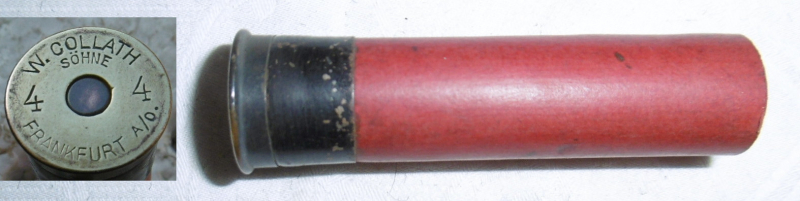 Angeboten wird 1 leere, ungebrauchte Collath-Schrothülse mit horizontaler Stiftzündung No.4, entspricht Kal.16 rote TESCO für rauchloses Pulver, mit fester Papphülse. eingeprägt gestempelt: ( W.COLLATH 4 FRANKFURT a.O 4 ) Fertigung vor 1928. Diese Hülse lagerte auf dem offenen Dachboden der Büchsenmacherei ERDELT in Neustadt/Haardt (Weinstraße). 100 Jahre haben eine Menge Schmutz hinterlassen, der noch nicht ganz entfernt ist.