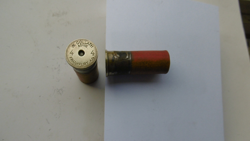 Angeboten wird 1 Collath-Schrothülse mit horizontaler Stiftzündung No.4, entspricht Kal.16 rote TESCO für rauchloses Pulver, mit fester Papphülse. eingeprägt gestempelt: ( W.COLLATH 4 FRANKFURT a.O 4 ) Die Hülse wurde verkürzt und als Platzpatrone geladen. Fertigung vor 1928. Diese Hülse lagerte auf dem offenen Dachboden der Büchsenmacherei ERDELT in Neustadt/Haardt (Weinstraße). 100 Jahre haben eine Menge Schmutz hinterlassen, der noch nicht ganz entfernt ist.