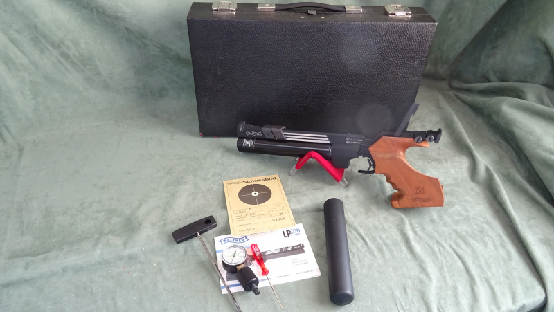 Gebrauchte Pressluftpistole von Walther, LP200, F-Variante, im Kaliber 4,5mm/.177. Matchluftpistole mit Top Schußleistung. Einzellader. Die Pistole ist im Koffer, mit einem Wechselgriff in Gr. S, mit verstellbarer Ballenauflage, der montierte Griff hat die Gr.M, ebenfalls mit verstellbarer Ballenauflage.. Die montierte Kartusche ist mit Manometer und Neu, der Tüv geht noch bis 03/2036. Die zweite Kartusche ist abgelaufen und geht nur noch zum Training. Es ist noch das Füllstück für 200bar und ein Manometer inklusive.. Es sind zwei Laufgewichte montiert. Laufmantel ist mit einem Kompensator ausgestattet.