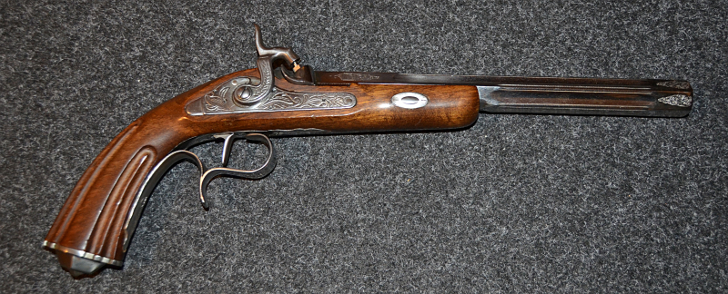 Biete hier eine sehr schöne Perkussion-Duellpistole an. Wenn ich es richtig gelesen habe = Kaliber 14. (Foto anbei), gezogener Lauf.