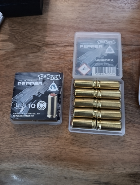 Sie bieten hier auf jeweils 1 Packung mit 10 Patronen 9mm Pfeffer von Walther Umarex. Die Patronen sind 12.21 abgelaufen wurden immer trocken gelagert.