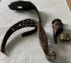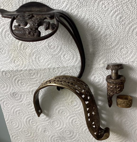 Griffteile und sonstige Kleinteile für Degen. Der dunkle Handschutz mit Klappscharnier. Abgabe von Privat an Sammler, ohne jede Garantie und auch keine Rücknahme der Stücke