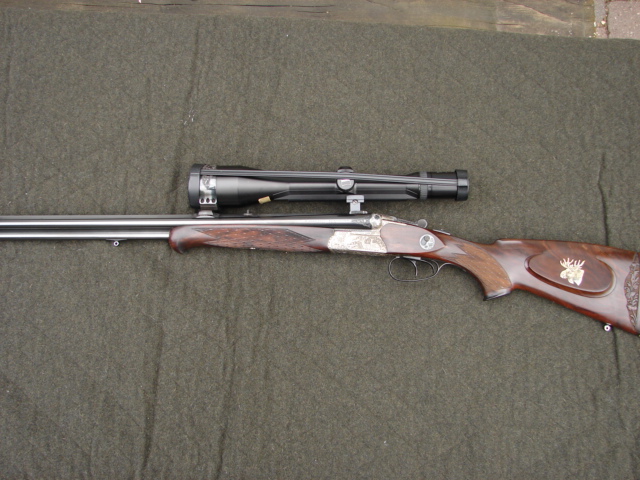 Ungeführter Doppelbüchsdrilling von H. Erhardt Benshausen Suhl. Der Drilling befindet sich im absolut neuwertigen Zustand!! Kaliber 9,3x74R / 9,3x74R und 20/76 (15.9) Schrotlauf. Lauflänge 63,5 cm, Schaftlänge 35,5 cm, Zielfernrohr Zeiss Diavari ZM 3-12x56 T, Abs. 44 mit Leuchtpunkt. Gehobene Holzklasse mit Einlagen. Absolute Spitzenverarbeitung. Stecher im vorderen Abzug. Die beiden Läufe schiessen auf 100 meter 4 cm zusammen. Norma Munition, Rest ist vorhanden und wird an Selbstabholer übergeben.