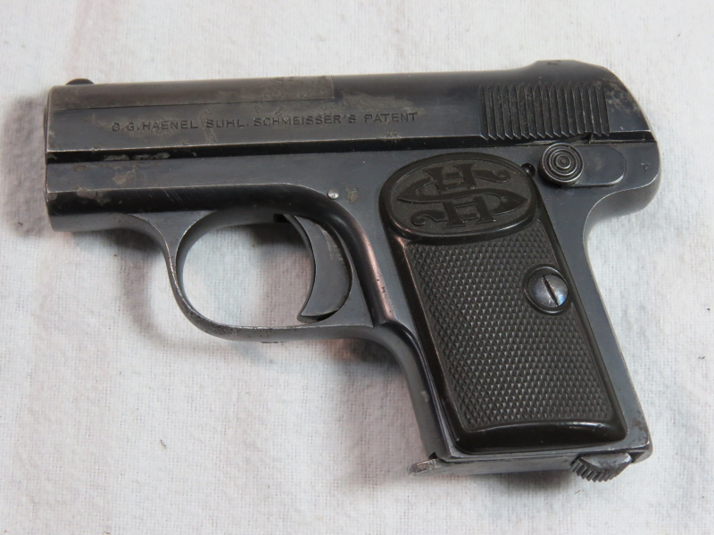 Pistole Haenel Mod. 1 - Haenel Suhl-Schmeisserpistole - Kal. 6,35. Lauf gut blank. Gebrauchter Zustand mit Gebrauchsspuren siehe Bilder. Verkauf EWB.