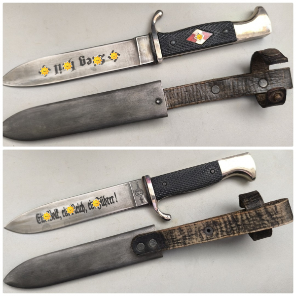 Dieses einmalige Fahrtenmesser von dem Blankwaffenhersteller KNECHT, wurde wohl von Privat in Auftrag gegeben. Das auch schon mal gemacht wurde. Dieses Unikat dürfte es wohl kein zweites mal geben. Aber schauen Sie mal selber. Die Stahlblechscheide, magnetisch, ist mit einer wunderschönen Brünierung. Trageleder Top. Privatverkauf, ohne Gewährleistung, Garantie oder Rücknahme.