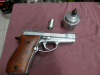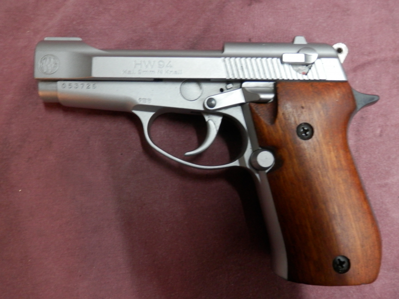 Weihrauch HW94 Schreckschusspistole, 9mm R.K., chrom mit Holzgriffschalen. Leider fehlt das Magazin.