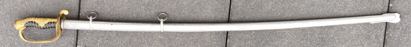 Polierte leicht geschwungene Rückenklinge, vergoldetes fein verziertes Gefäß, originale Vernietung. Scheide mit zwei Tragebändern. Gesamtlänge mit Scheide 101cm.