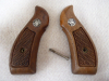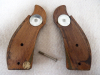 Ein Paar Griffschalen, die ich einmal für meinem S&W-Revolver, Modell 686, Round Butt-Ausführung, gekauft hatte: Holz, zweiteilig, mit S&W-Emblem. Die Farbabweichung der beiden Hälften dürfte aus dem Gebrauch resultieren.