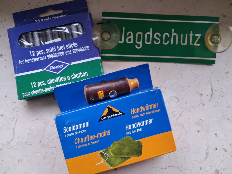 Kleines Konvolut aus Taschenwärmer, Jagdschutz Autoschild und Hubertus Blatter