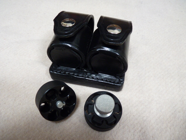 Zu ersteigern gibt es aus einem Nachlass zwei Speedloader mit passendem Holster, augenscheinlich bisher unbenutzt, siehe Fotos.