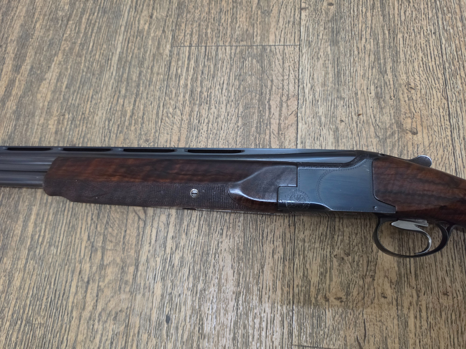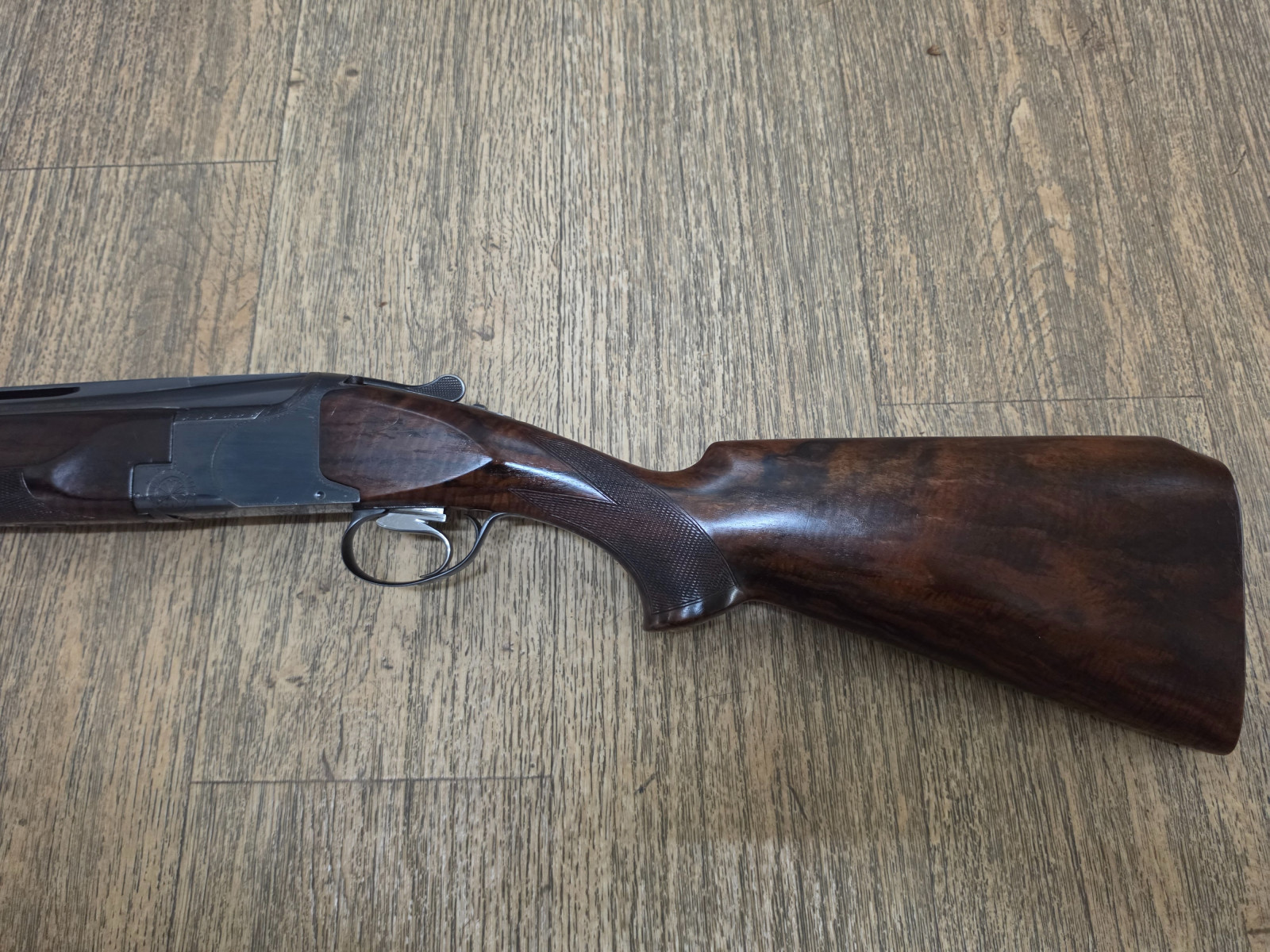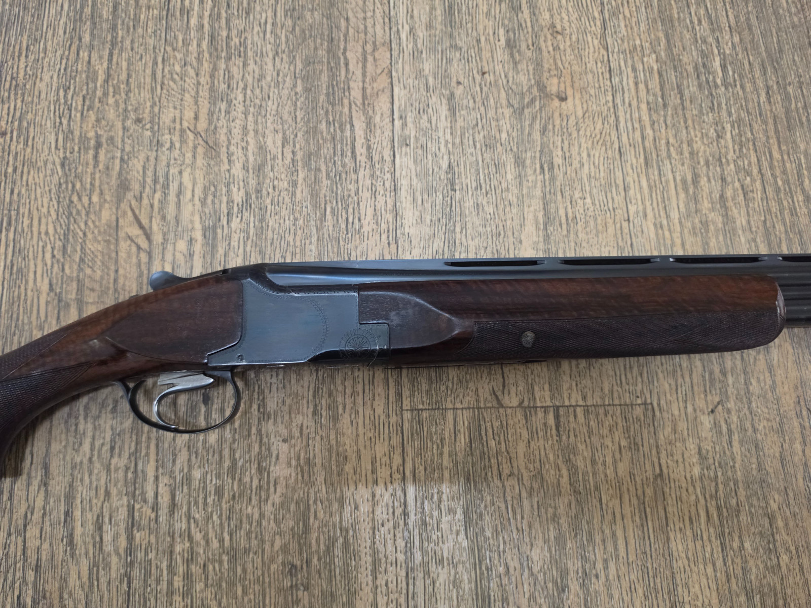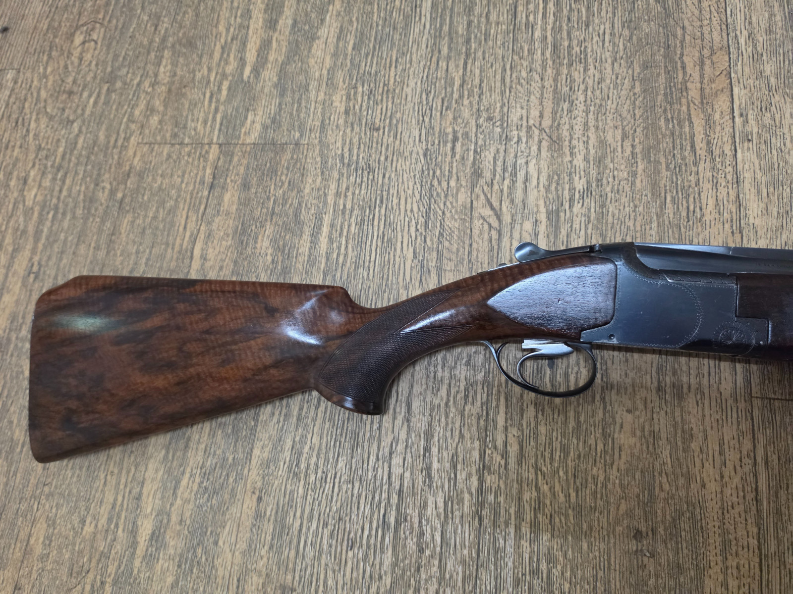 FN B25 Skeet im Kal. 12/70, Lauflänge 71cm, Laufgewicht, Einabzug (umschaltbar), Ejektor, Schienenbreite 16mm, Handschäftung, Rechtsschaft, gutes Holz, Schaftlänge 35,5cm, Senkung vorne ca. 44mm, Senkung hinten ca.65mm, Grifflänge ca.98mm (gemessen von Mitte Abzug bis vorderkante Pistolengriff). Im Vorderschaft ist eine Fingerrille für den Zeigefinger eingearbeitet.
