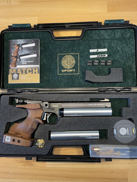 Steyr LP 50 RF Compact - 5 schüssige LP für Wettkampf und Training dynamischer Disziplinen Die Steyr LP 50 RF Compact ist eine 5 schüssige Pressluftpistole welche optimal geeignet ist zum munitionskostensparenden Training dynamischer Disziplinen bis zu 25 Metern. Die LP 50 ist jedoch bei Einsatz einen 1-Schuss Magazines auch für sämtliche Einzelschussdisziplinen zugelassen. Mit der LP 50 erwerden Sie somit eine echt 2in1 Waffe. Luftpistole Steyr LP 50 RF compact 4,5mm 7,5 Joule frei ab 18 Rechtsschütze schwarz Griffgröße L die Waffe ist in einem guten Zustand, neu gekauft 09/19 2 Kartuschen (Silber ) und restliches Originalzubehör (Werkzeug, Fülladapter, Koffer, Beschreibung) 1 x 5-Schuss-Magazine, 1 x 1-Schuss-Magazin,zusätzliche vorhanden ist eine Handballenauflage für Auflageschiessen die Auflage ist in der Höhe verstellbar, montiert ist ein Klappkorn es ist ohne Werkzeug in zwei Höhen verstellbar für Präzision und Duell.ideal auch für die Disziplin, Mehrkampf . Die zwei verschiedenen Höhen können durch einfaches Umklappen fixiert werden. Kornbreite ist 4mm Privatverkauf ohne Umtausch und Gewährleistung, Altersnachweis erforderlich.Die Luftpistole kann natürlich auch vor Ort abgeholt werden, wenn die Auktion ausgelaufen ist.