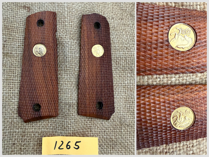 Die Holzgriffschalen wurden anlässlich des 150-jährigem Bestehen der Firma Colt gefertigt und mit den damaligen Colt Pistolen Government/Gold Cup/National Match ausgeliefert. Die originalen Griffschalen mit Gold Emblem befinden sich in einem sehr guten Zustand, siehe Foto.