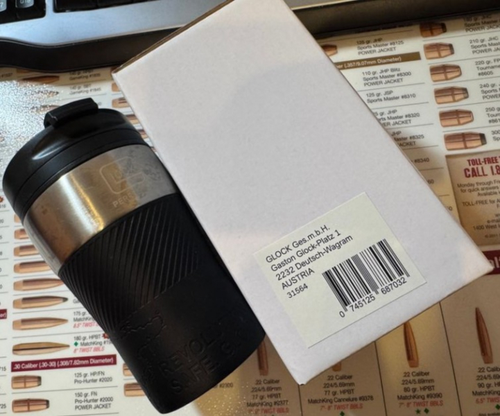 Zum Verkauf steht ein original Glock Thermobecher in schwarz / silberner Ausführung mit Glock-Logo. Der Becher ist neu und originalverpackt (OVP).
