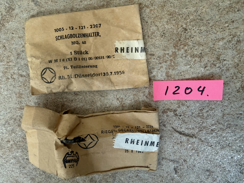 Sie bieten hier auf eine originalen MG42 / MG 1 / MG 3 Deckelriegel und Schlagbolzenhalter, Hersteller Rheinmetall, originalverpackt und fabrikneu aus den 1950/1960er Jahren. Noch mit MG42 gekennzeichnet. Auch passend für MG53. Freie Ersatzteile.