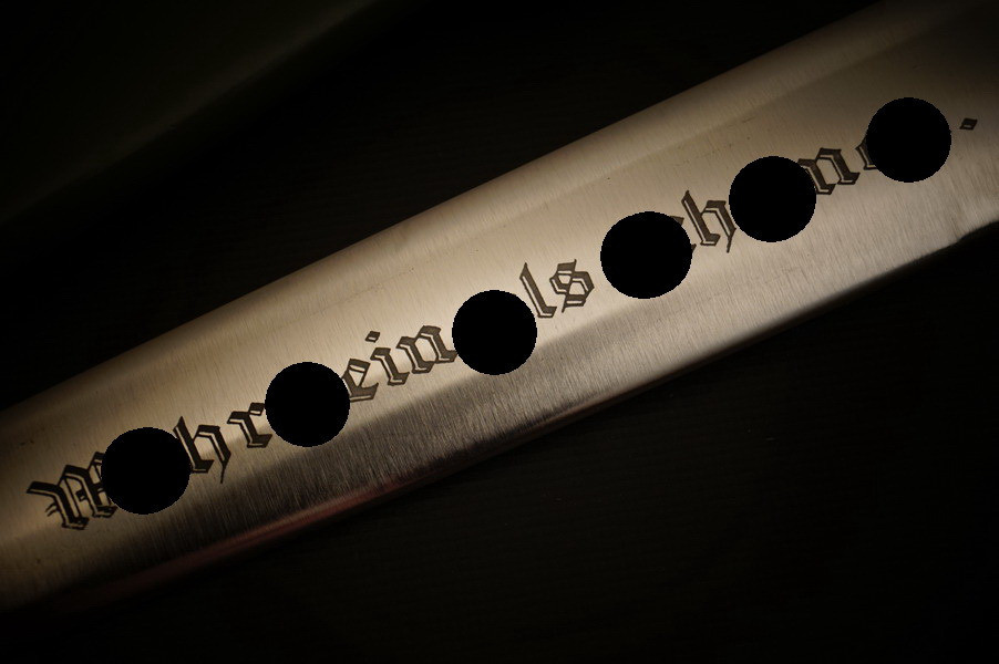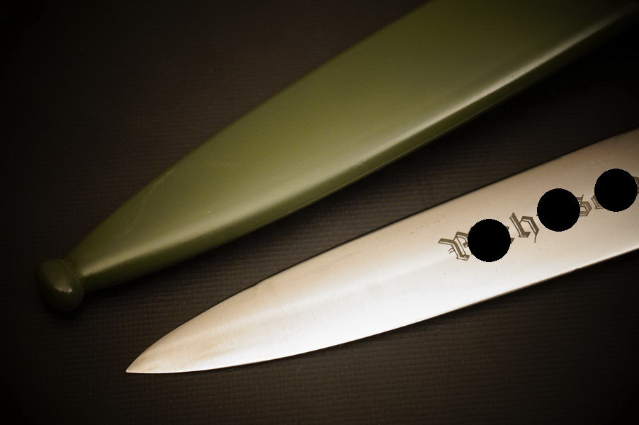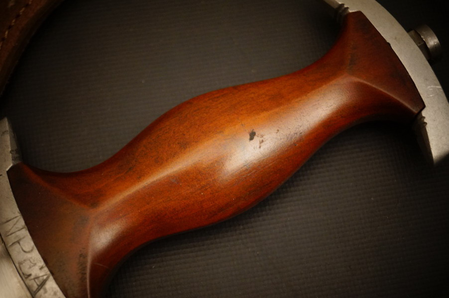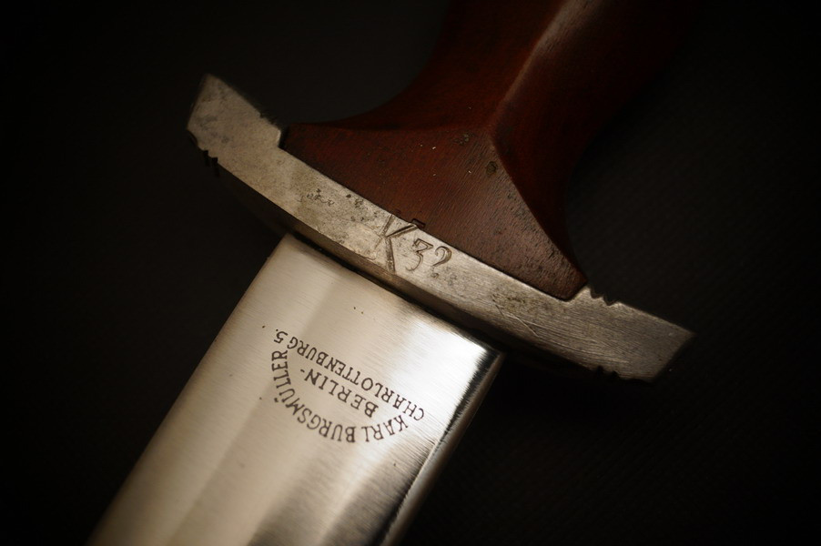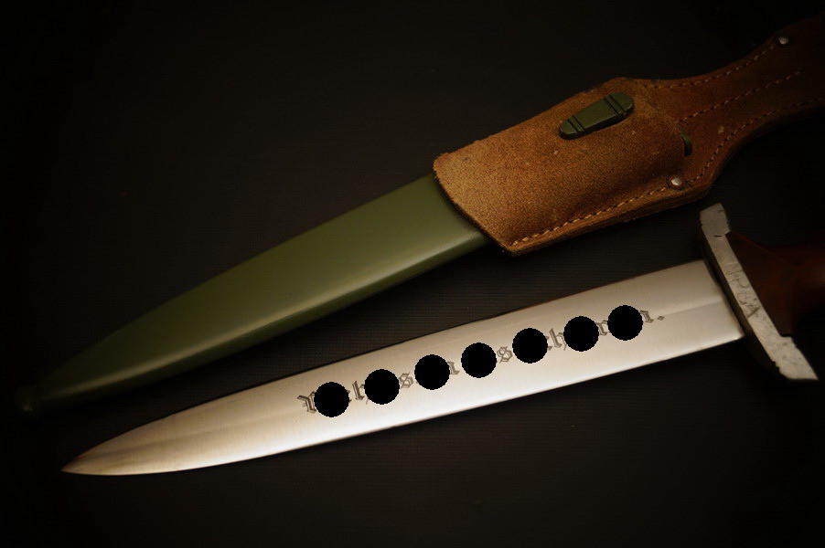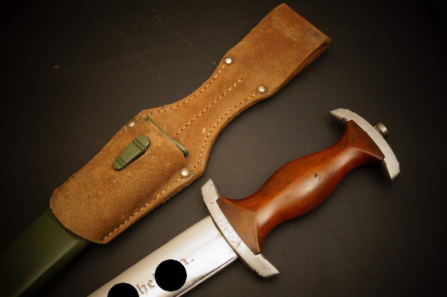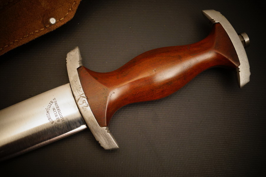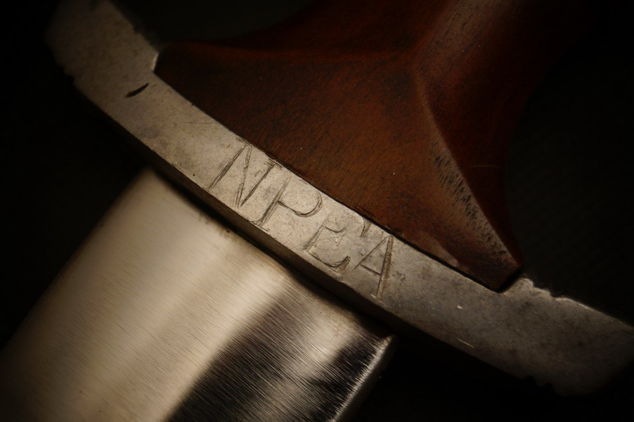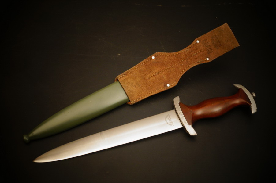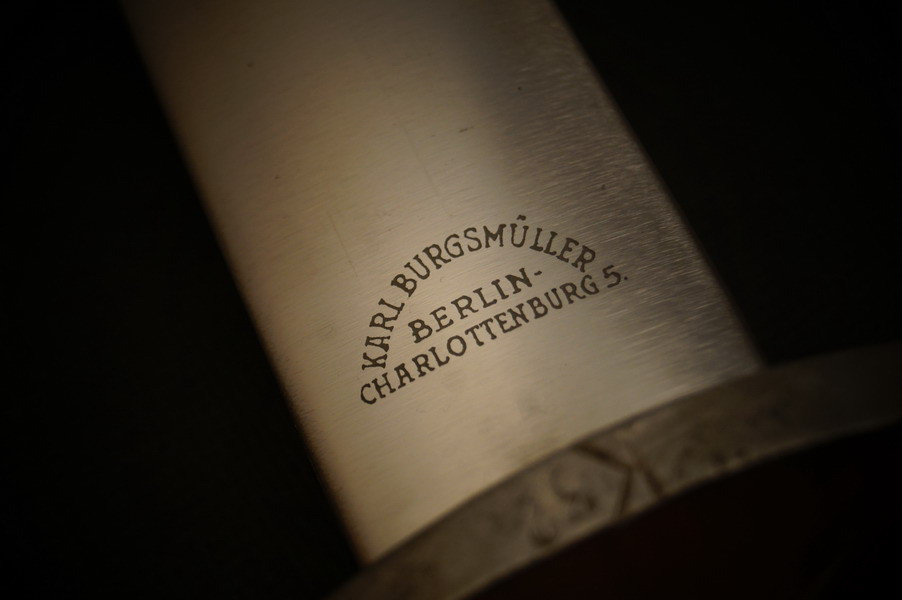 Fundzustand. Stahlscheide, saugender Sitz der geschmiedeten Klinge. Motto und Hersteller geätzt. Holzgriffschalen und paarige Parierstangen aus Alu. Kopfschraube aus Eisen.
