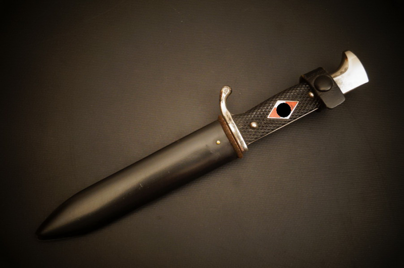 Fundzustand. Stahlscheide mit zwei Federn innen. Klinge mit Hersteller und 800 Jahr Feier Ätzung auf der Klinge. Raute mit Glasemaille.