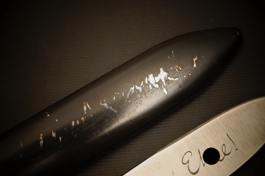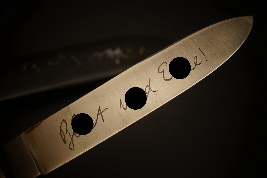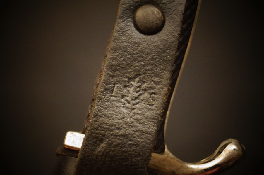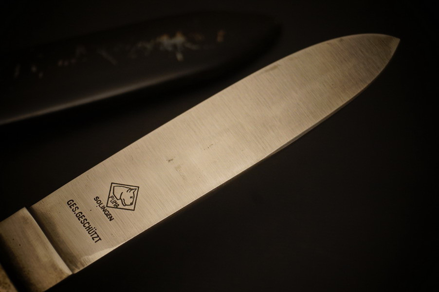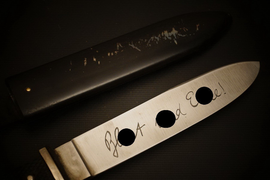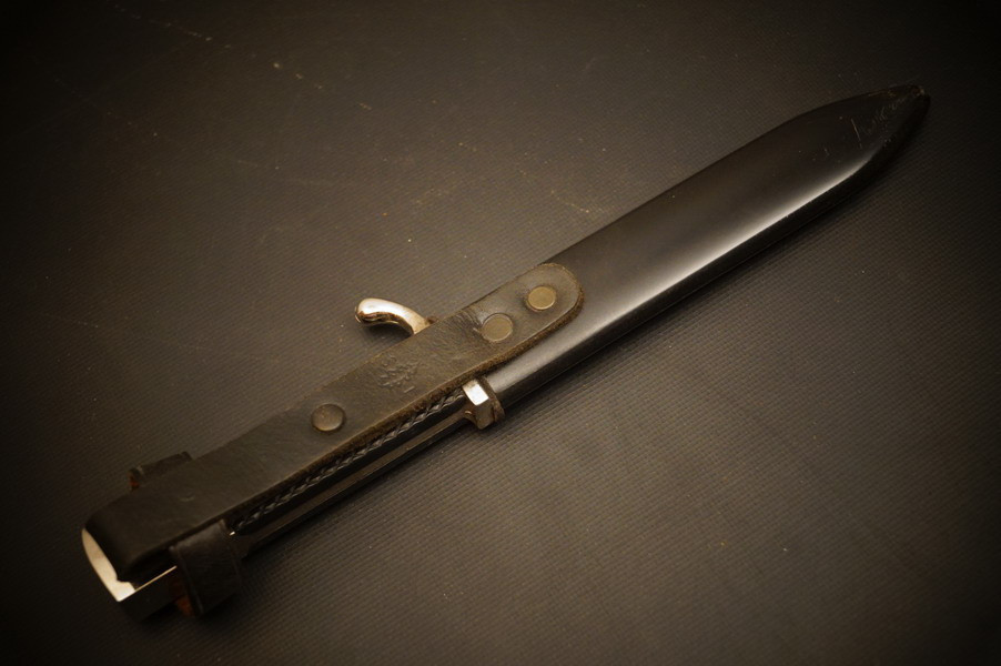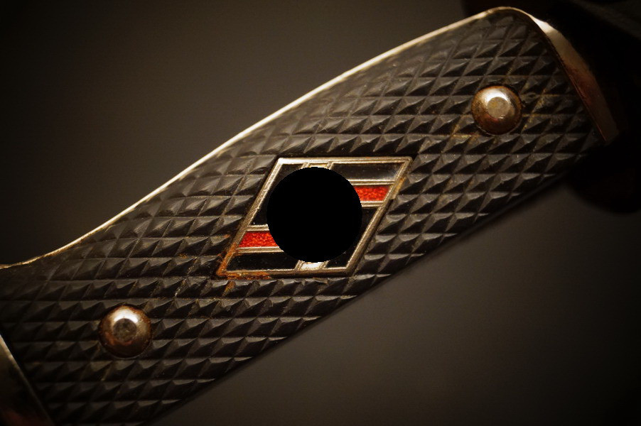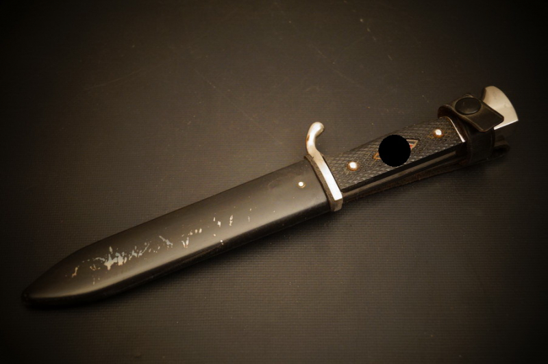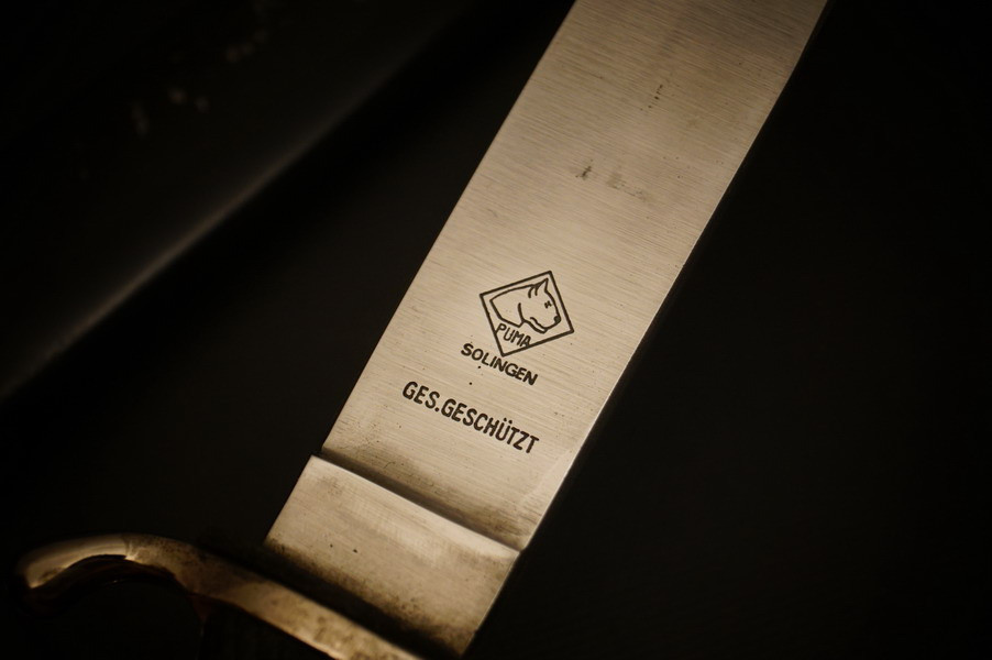 Fundzustand. Stahlscheide mit zwei Federn innen. Klinge mit Motto und Hersteller. Stahlklinge mit feinem Blauschliff. Raute mit Glasemaille.