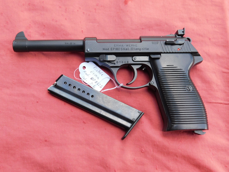 ERMA EP 882 S (Nachbau der Walther P38) Kal. 22 LR. langer Lauf, innen spiegelblank und Profil scharf, 1 Magazin dabei, Magazinfeder schwach, Verschluss fängt nicht immer. Gültiger Beschuss ist vorhanden.
