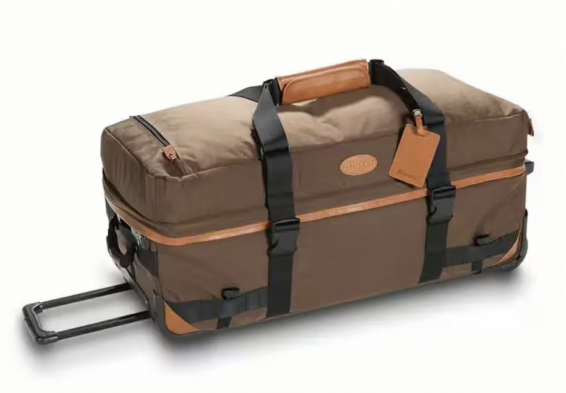 Praktischer Jagdreise-Trolley aus hochwertigem, extrem widerstandsfähigem Cordura mit edlen Echtleder-Applikationen. Das vielseitige Taschen- und Fächersystem mit zahlreichen Reißverschlusstaschen und Dokumententasche außen (ideal für DIN A6) bietet optimalen Stauraum für den kompakten Transport des gesamten Jagdgepäcks. Zusatztasche. Komfortables Handling durch versenkbaren Teleskop-Griff, große Kugellagerrollen, ausfahrbarem Standfuß und längenverstellbare, breite Tragegurte. Tragegriff aus griffigem Gummi an der Kopfseite mit stoßfesten Schließen. Sichere Fixierung des Equipments mit fünf längenverstellbaren Gurten. Zahlenschloss. Leider fast nirgends mehr erhältlich. War genau dreimal in Auto auf Jagdreise nach Ungarn.