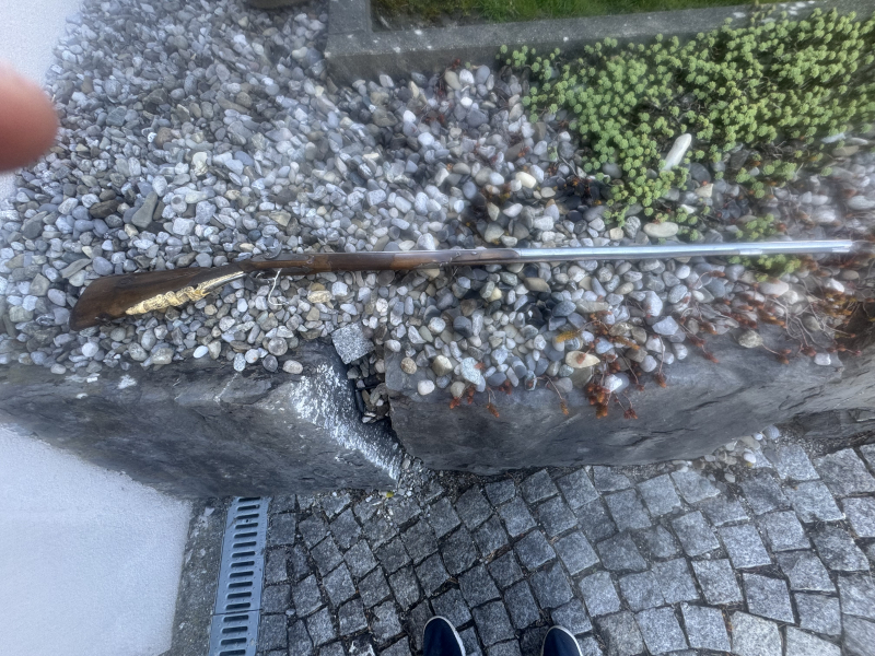 .Perkussionsflinte, London, Kal. 16mm LL 1070mm, TL 1470mm, Lauf hintere Hälfte oktagonal, vorne rund, blank poliert. Messingkorn, eiserne Ladestockpfeiffe. Flache Schlossplatte mit Randgravur, Lauf und Schlossplatte beschriftet "London", weiter sind auf dem Lauf arabische Schriftzüge zu sehen. Gravierte Eisenarmatur, beschnitzte Nussholzhalbschäftung mit Fischhautverschnitt am Kolbenhals und Vorderschaft. Kolbenunterseite aus beschnitztem Bein, montierte Riemenbügel, hölzerner Ladestock mit eisernem Dopper. #